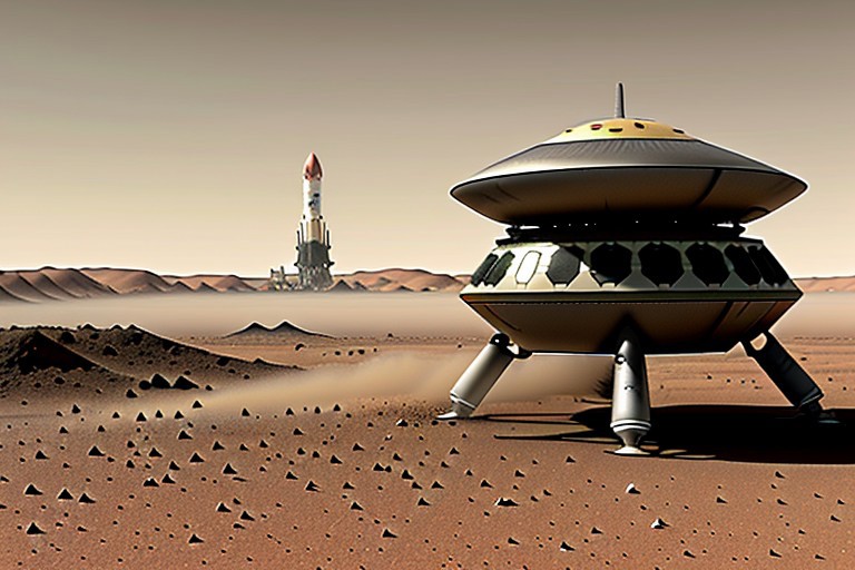 An extraterrestrial alien spacecraft lands on the surface of Mars, ((alien ship is landing in the background)),((Rocket landing engines kick up dust during the landing)), dim sunlight shines through the dust,