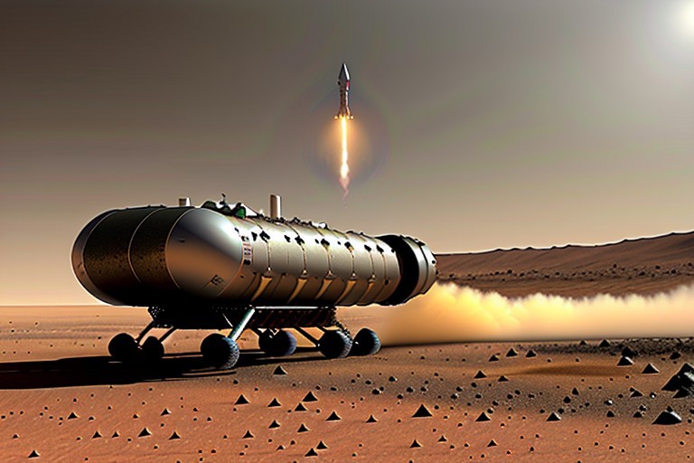 An extraterrestrial alien spacecraft lands on the surface of Mars, ((alien ship is landing in the background)),((Rocket landing engines kick up dust during the landing)), dim sunlight shines through the dust,
