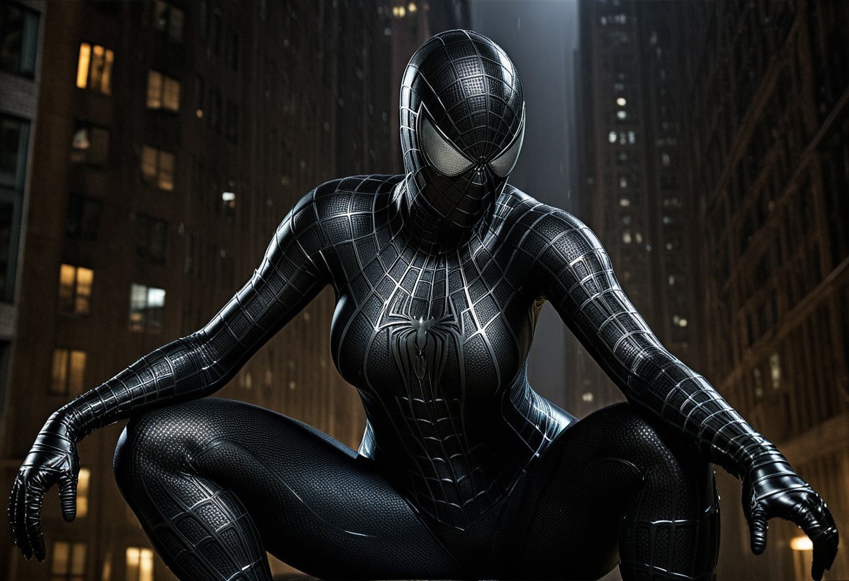score_9, score_8_up, score_7_up, best quality, realistic, masterpiece, beautiful detail, hyperrealistic, ((1girl, woman body, big breasts)), amazing detailed full body portrait of a beautiful girl, wearing a realistic and highly detailed black raimi spider-man suit with mask, ((huge muscular girl)), professional model of korean girl wears ultra - detailed black raimi spider - man suit, ultra - detailed and grained black raimi spiderman suit, suit covered entire body and hand, black spiderman gloves, wet, (ellegant sitting pose), (full body), (dirty skin), close up, octane render, highly detailed, volumetric, dramatic lighting, (highest quality:1.1), (HDR:1.3), (top quality, best quality), realistic, high definition,
