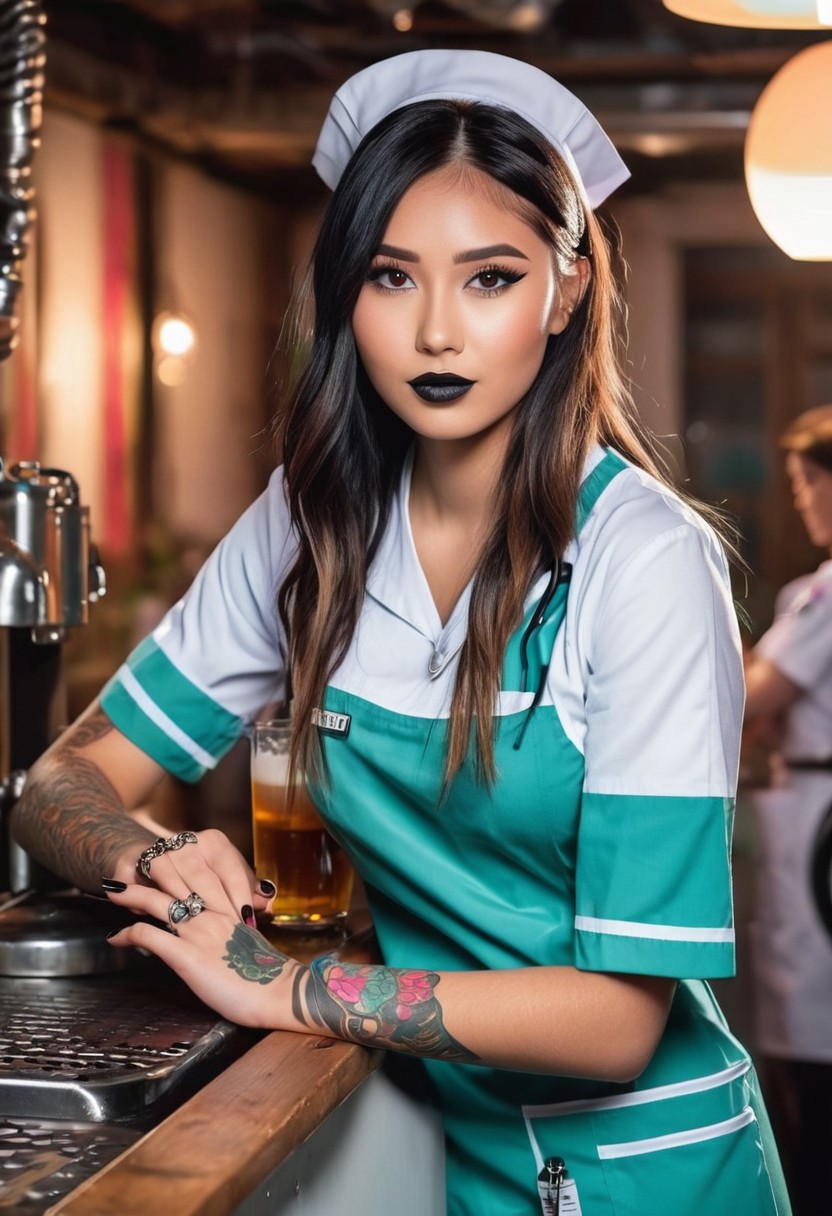 (RAW photo, subject, 8k uhd, dslr, soft lighting, high quality, film grain, Fujifilm XT3, masterpiece, best quality, extremely detailed photograph, volumatic light, ray tracing,, extremely detailed 8k wallpaper), abstract fashion portrait of (four:2.0 sexy nurses :2.0), (a cute 19yo asian girl and a cute 24yo german woman and a beautiful 23yo african girl, very (light:2.0) white or brown or black skin, dressed as sexy nurses, dressed in latex, clear blue or green or black eyes, short or long light blond or long brunette or very long black straigt or wavey or curly hair with undercut hairstyle, chin bangs, dread hairstyle, braid hairstyle, (colorful streaks:1.8), very (big:1.8) or very (big:2.0) , perky tits, perfect hourglass figure, delicate face and eyes, (glasses:0.8), (glossy:1.6) (pink or red or dark red or orange or blue or black or green or rainbow lips), makeup, painted nails, navel piercing, nose piercing, (tattoos:2.0), sexy pose), at counter in beergarden, hold tray with some glasses of beer, in hand look at viewer, kiss