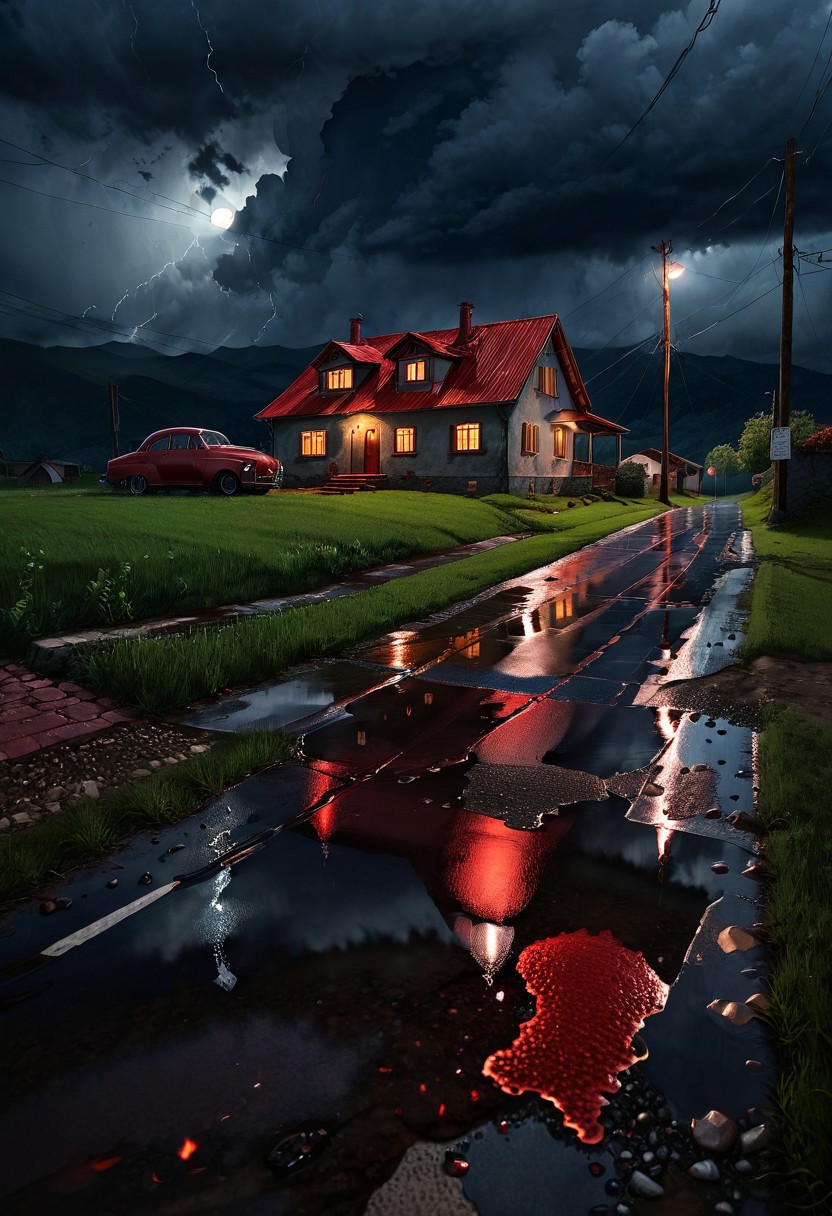 Stormy sky, dark clouds, rural landscape, isolated house with red roof, dim streetlight, gravel road, puddles reflecting light, old red car, mountains in the background, detailed, dramatic lighting, evening time, moody atmosphere, vector illustration style art, cold color palette, birds flying, power lines.
