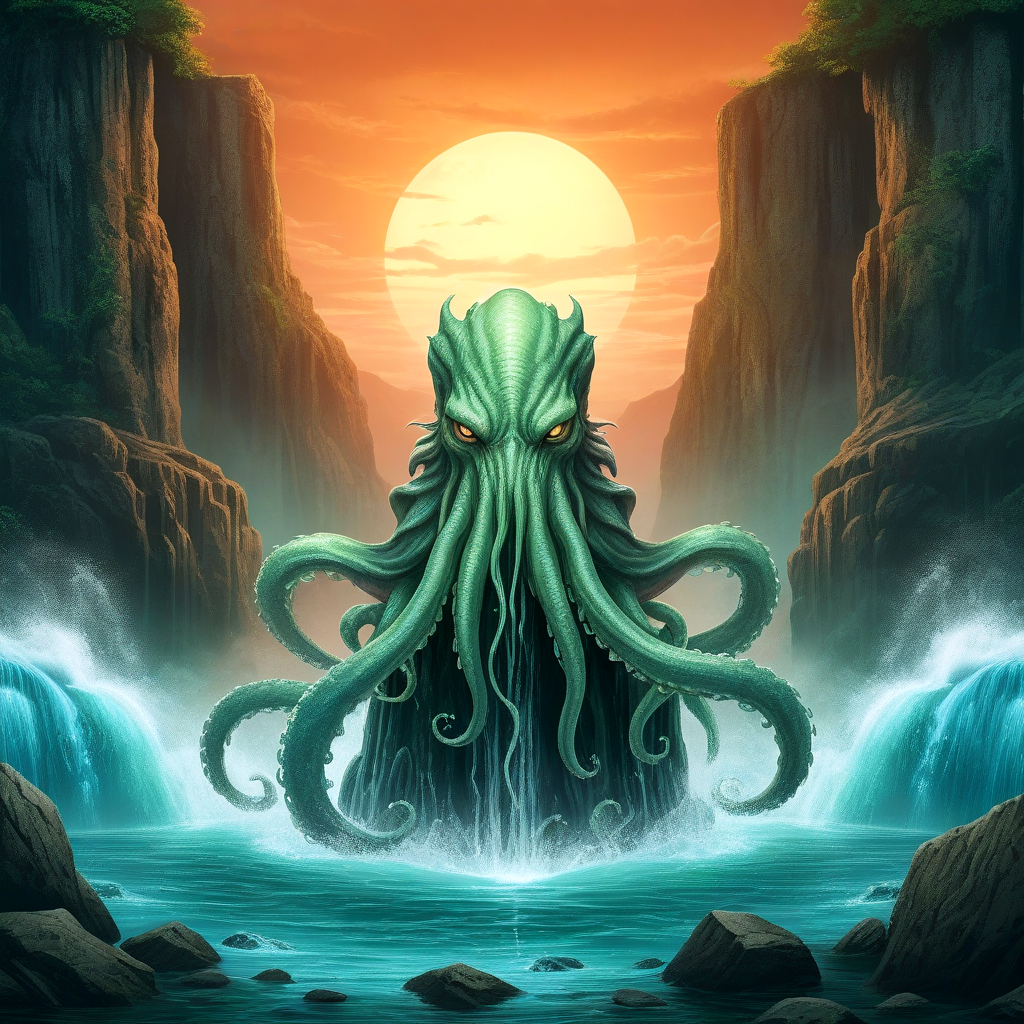 Nautical-themed abnormal mysterious cthulu cat monster, waterfall background . Sea, ocean, ships, maritime, beach, marine life, highly detailed
