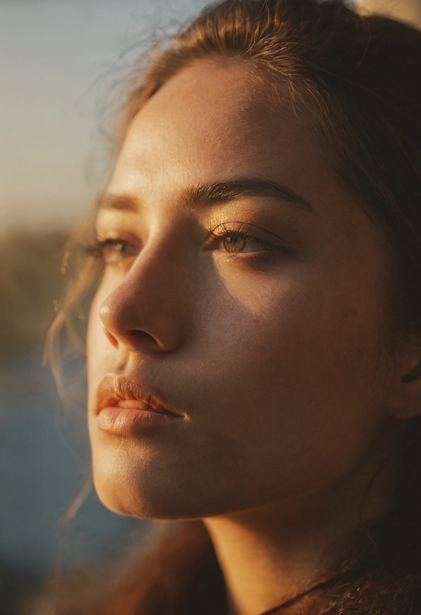 striking details, looking away, window glass reflection on face, Enchanted Light: Photograph with a Panasonic Lumix S5 and a 24mm f/1.4 lens, using a shallow depth of field to focus on a person bathed in the soft, diffused light of sunset. Capture the striking details of their skin and natural tones, with a beautifully blurred background. Apply advanced color grading to enhance the warm sunset hues and the gentle shadows for a dreamy, otherworldly quality.