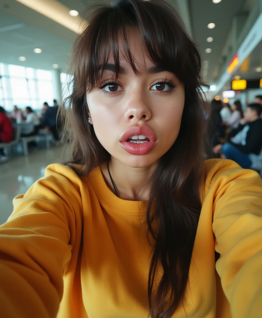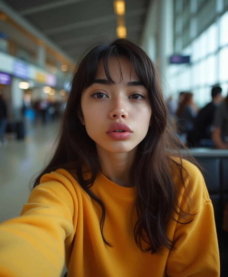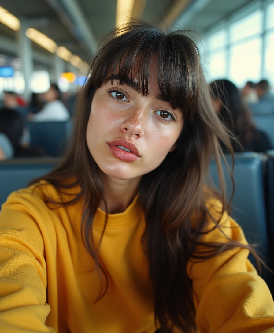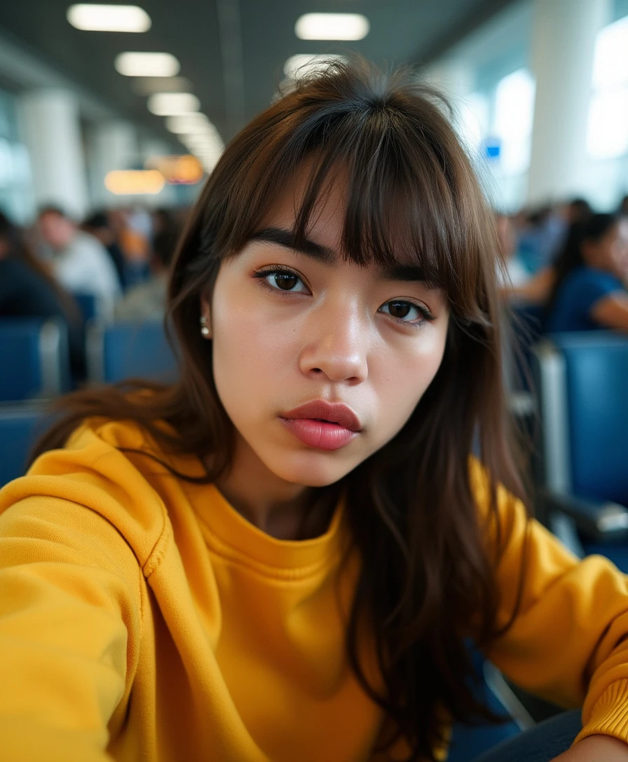 selfie of a beautiful colombian woman, she is 19 years old, brunette, bangs, tan skin, she is wearing a yellow crewneck sweatshirt, brown eyes, big lips, slight smirk, sitting on a bench in an airport terminal waiting for her flight, pouting lips, dutch angle, film grain, shot with an iphone camera, crowded background, interesting background