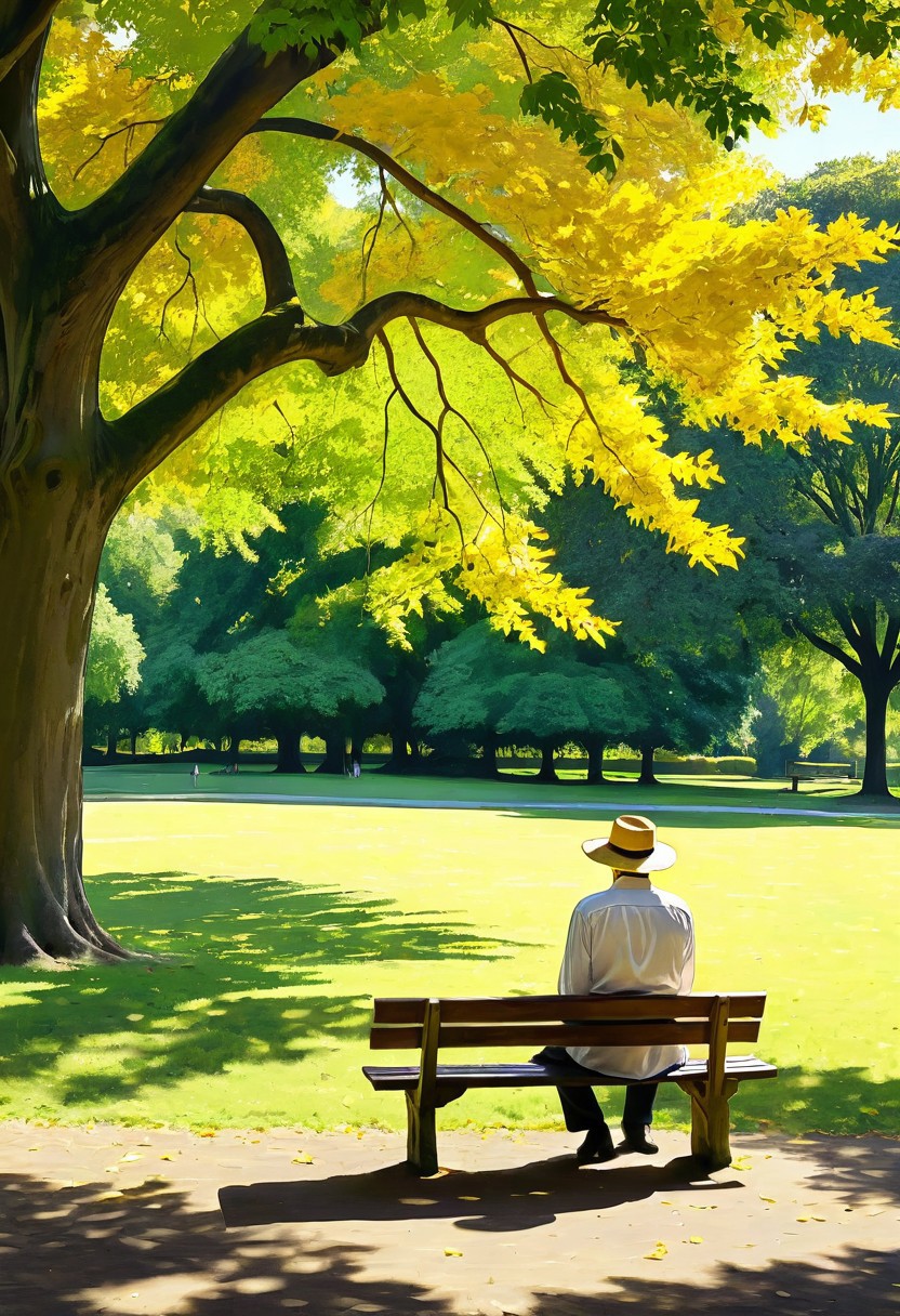 pen outline Digital painting, A serene, sunlit park in early autumn with golden leaves gently falling. In the foreground, a large tree with a canopy of vibrant green and yellow leaves filters the sunlight, casting dappled light and shadows on the grass below. A solitary figure wearing a white shirt and a straw hat sits on a wooden bench, facing away from the viewer, creating a sense of peace and contemplation. The park is lush and spacious, with trees and greenery extending into the background. The overall atmosphere is calm and tranquil, capturing the beauty and quietude of a peaceful afternoon in nature."