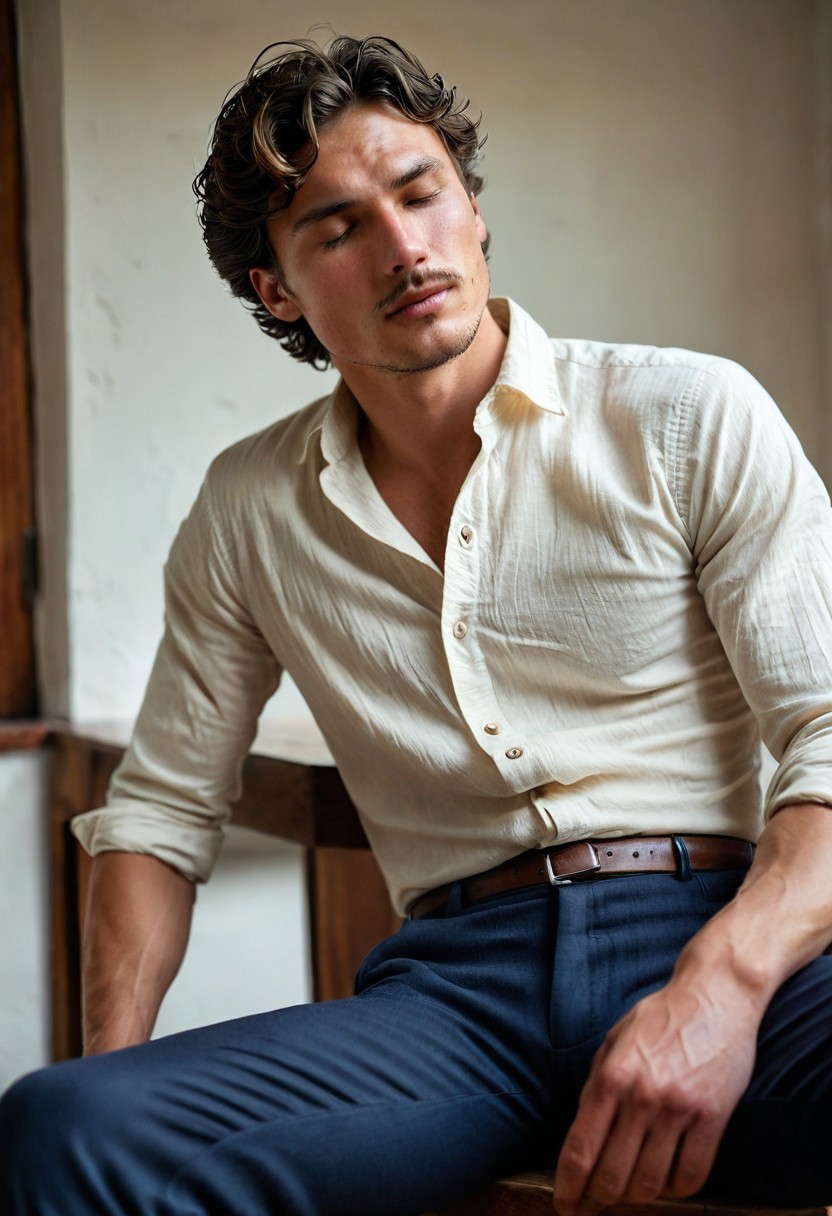 Hyper-realistic photograph, young man, short-length wavy dark hair, handsome, chiseled attractive face with sharp features, slight mustache, light to medium skin tone, relaxed expression, muscular, lean, eyes partially closed, faint smile, contemplative mood, seated, one knee up, right arm on knee, left arm relaxed, light wrinkled button-up shirt, off-white shirt, top buttons undone, chest slightly revealed, dark blue trousers, casual yet formal, slightly low camera angle, soft natural lighting, ambient glow, blurred indoor background, neutral colors, warm vintage feel, soft focus, wrinkled fabric texture, neat facial hair, serene and reflective atmosphere.