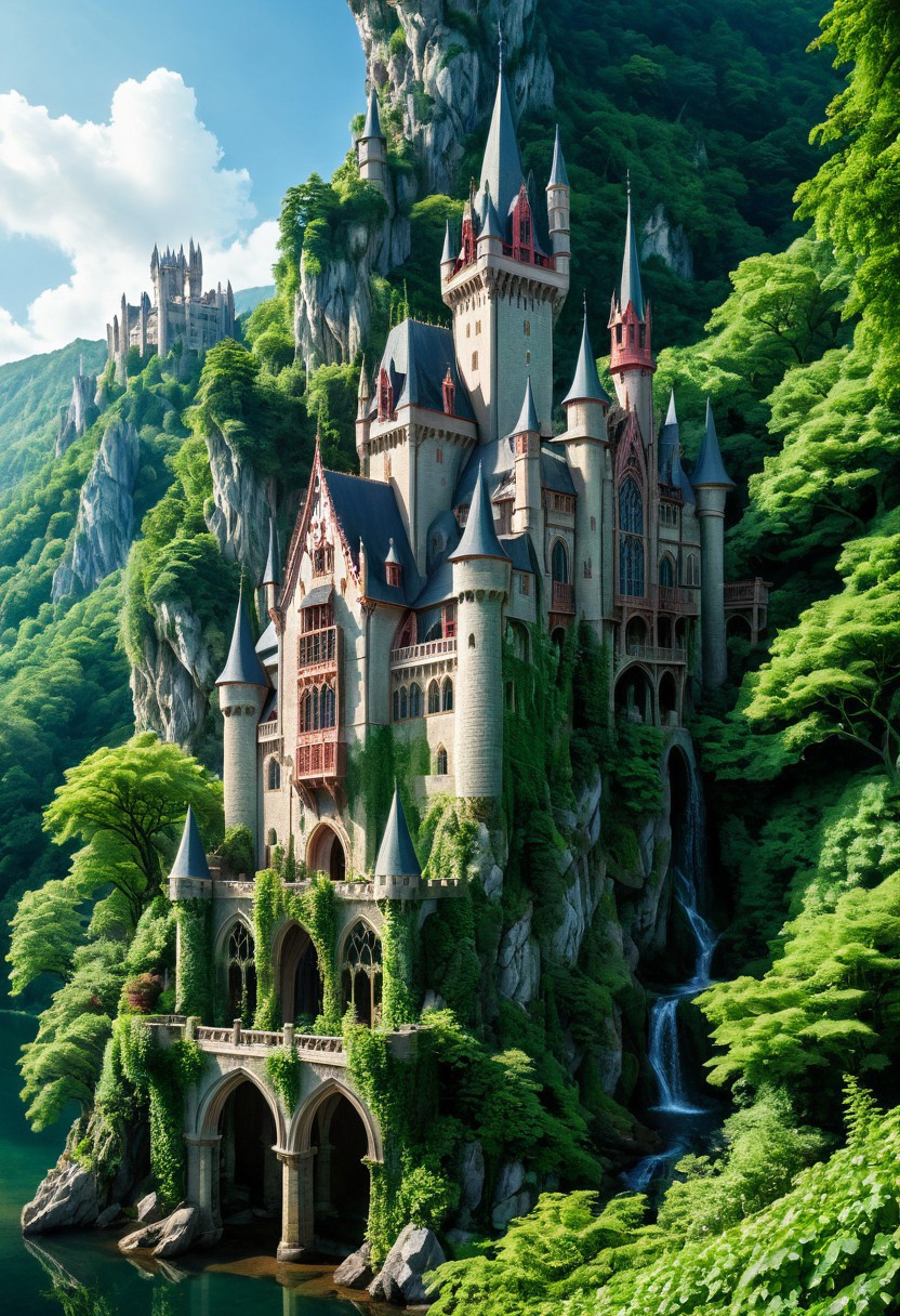 anime style, fantasy art, Create a fantastical, highly detailed castle nestled within a lush, forested mountainside. The castle features intricate Gothic architecture with tall spires and arched windows, topped with red-tiled roofs. The structure is partially covered with creeping ivy and surrounded by dense green trees and rocky cliffs. In the foreground, a serene lake reflects the image of the castle and the surrounding nature. The atmosphere is tranquil and enchanting, with soft, diffused light filtering through the foliage, creating a mystical, fairy-tale ambiance."