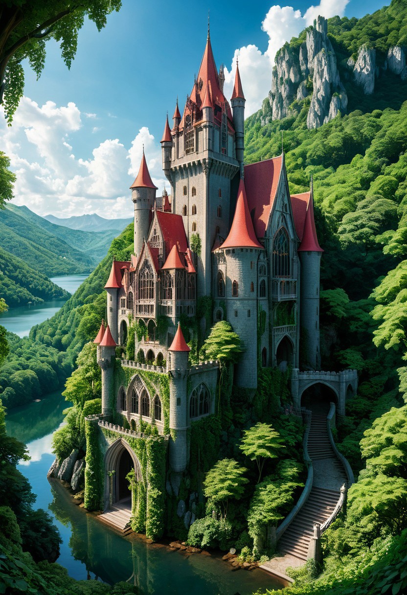 anime style, fantasy art, Create a fantastical, highly detailed castle nestled within a lush, forested mountainside. The castle features intricate Gothic architecture with tall spires and arched windows, topped with red-tiled roofs. The structure is partially covered with creeping ivy and surrounded by dense green trees and rocky cliffs. In the foreground, a serene lake reflects the image of the castle and the surrounding nature. The atmosphere is tranquil and enchanting, with soft, diffused light filtering through the foliage, creating a mystical, fairy-tale ambiance."