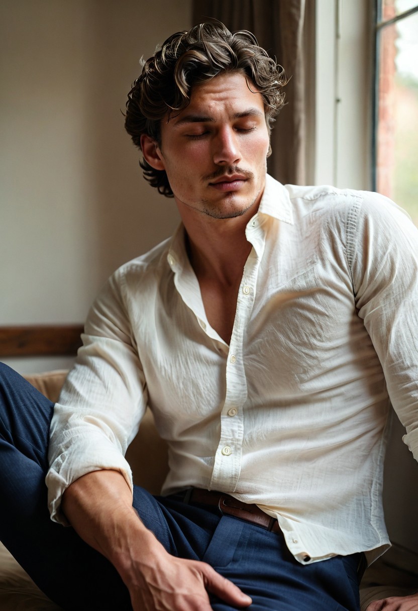 Hyper-realistic photograph, young man, short-length wavy dark hair, handsome, chiseled attractive face with sharp features, slight mustache, light to medium skin tone, relaxed expression, muscular, lean, eyes partially closed, faint smile, contemplative mood, seated, one knee up, right arm on knee, left arm relaxed, light wrinkled button-up shirt, off-white shirt, top buttons undone, chest slightly revealed, dark blue trousers, casual yet formal, slightly low camera angle, soft natural lighting, ambient glow, blurred indoor background, neutral colors, warm vintage feel, soft focus, wrinkled fabric texture, neat facial hair, serene and reflective atmosphere.