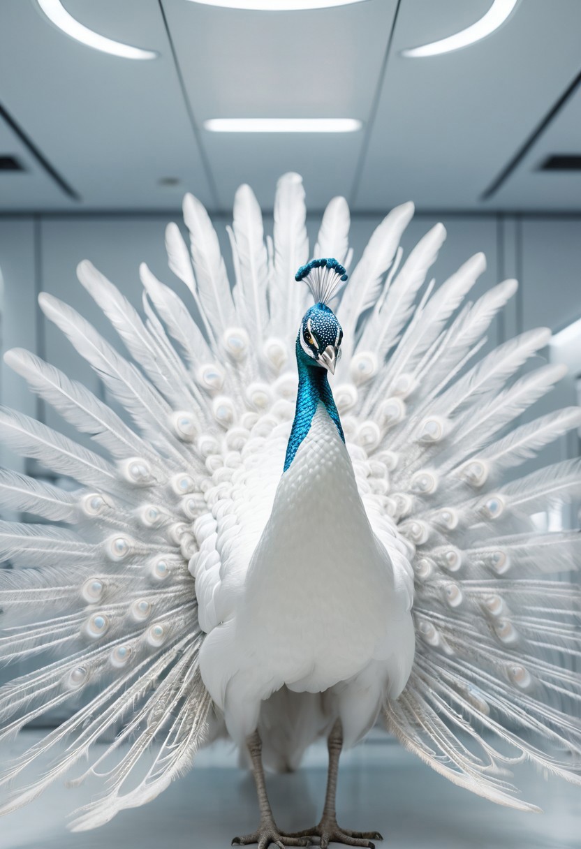 Hyper-detailed photography, stunning white peacock with a completely white plumage in a futuristic space station, sterile white interior, radiant highlights on the peacock’s feathers, natural lighting, analog film, Kodachrome, insanely detailed, 8K resolution, HDR, masterpiece, award-winning photography, fine art photography style