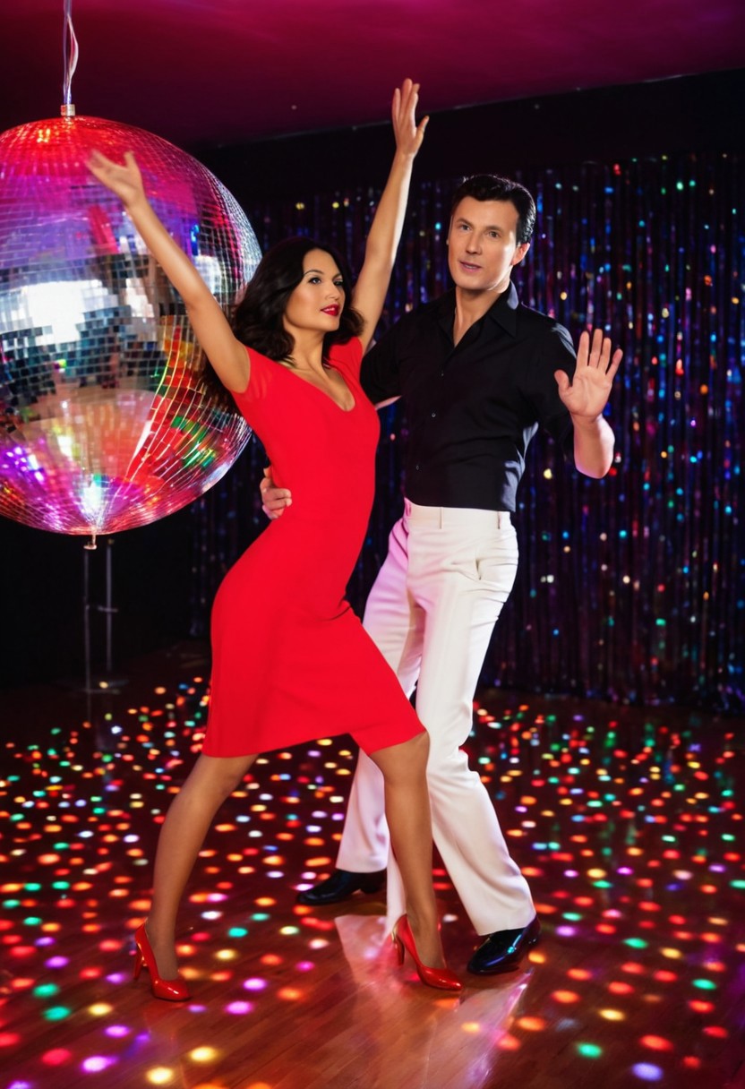 Image is a vibrant, dynamic scene from a disco dance floor, featuring a man and a woman as the central subjects. The man, with dark hair and a confident expression, is dressed in a white suit with a black shirt, striking a dramatic dance pose with one arm raised. The woman, with dark hair and a focused expression, is wearing a bright red dress and matching red shoes, dancing beside him. The background is filled with colorful lights and reflections from a disco ball, creating a lively and energetic atmosphere. The floor is illuminated with multicolored lights, enhancing the festive mood of the scene.