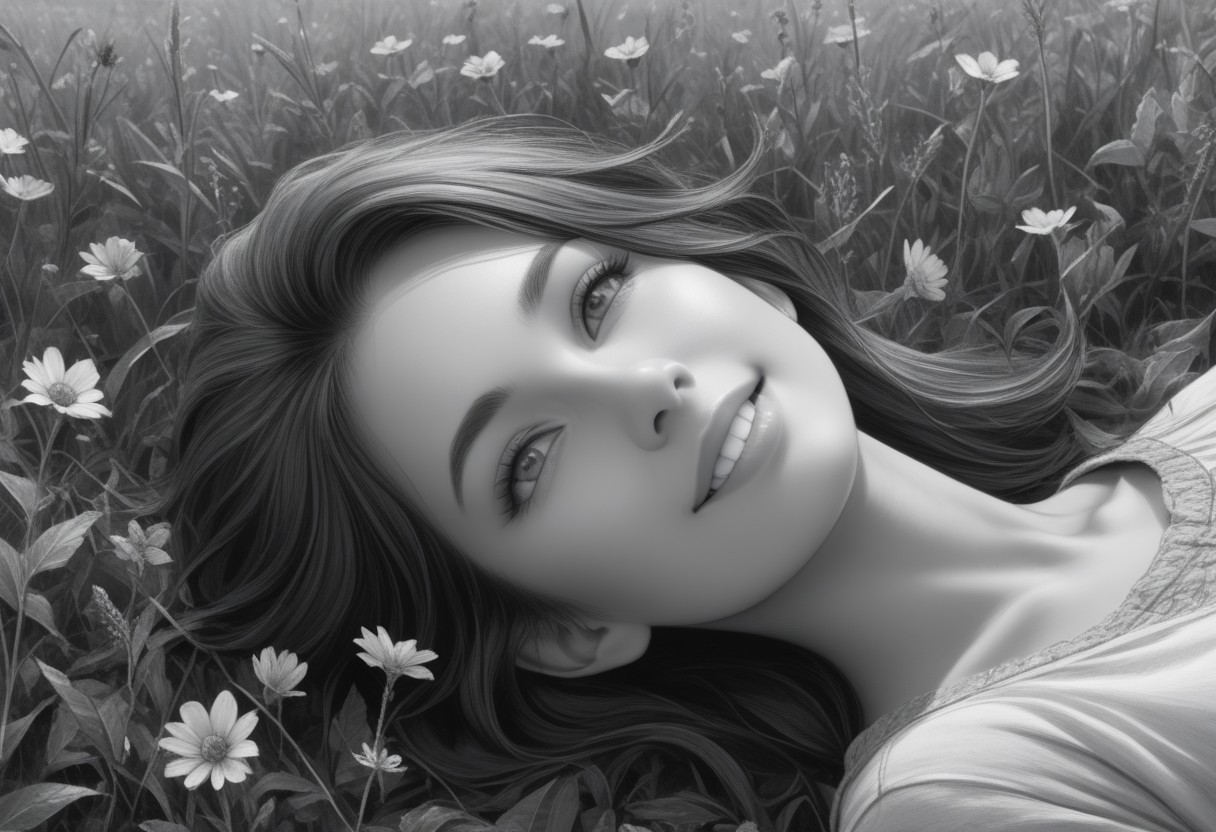 - A field of wildflowers under a bright, blue sky. In the middle of the field, a person lies on the ground, surrounded by colorful blooms, with a peaceful smile on their face. The scene captures the simple beauty and tranquility of nature, evoking a sense of serenity and freedom., pencil shading,charcoal drawing,tinted paper,pencil drawing,brutal dark b/w color scheme,A striking ultra HD charcoal drawing,overall composition is a perfect balance of intricate and insanely detailed elements (best quality,4k,8k,highres,masterpiece:1.2),ultra-detailed,(realistic,photorealistic,photo-realistic:1.37),UHD,professional,extreme detail description,sharp focus,physically-based rendering
