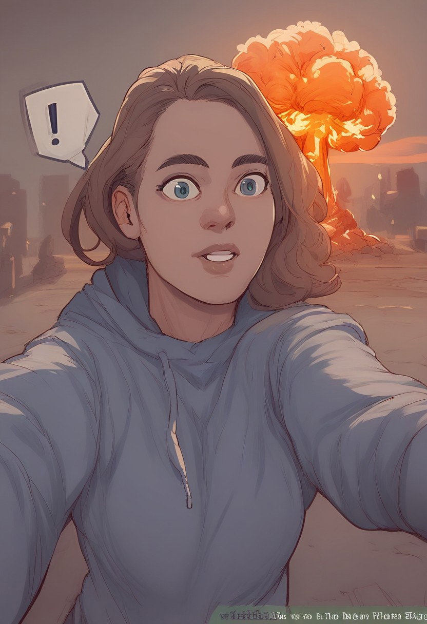 score_9, score_8_up, score_7_up, score_6_up, score_5_up, score_4_up, 1girl, selfie, exclamation mark, Nuclear Explosion