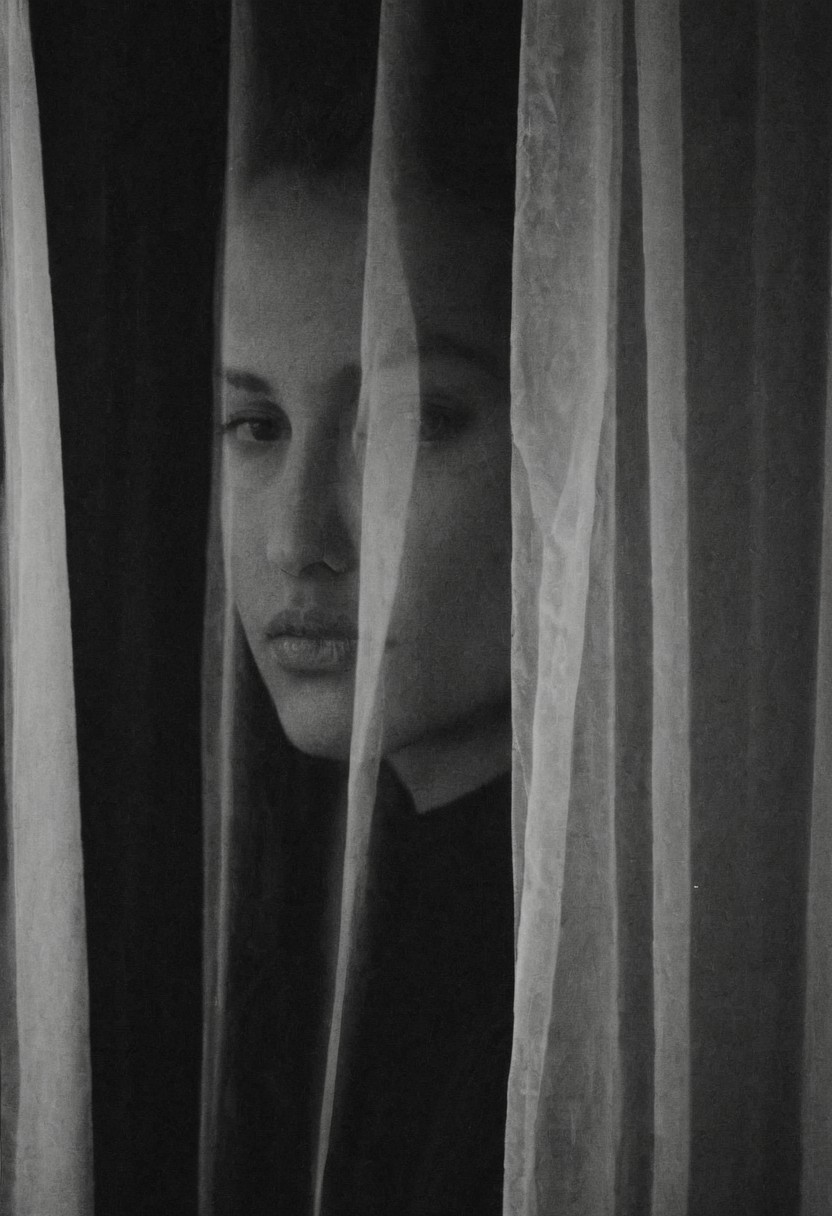 low quality image, noise, CLOSEUP hafl side PORTRAIT of women, BLACK AND WHITE IMAGE. black and white image. transparent curtain,dark, night, street light on face, perfect composition, surreal, looking at viewer.