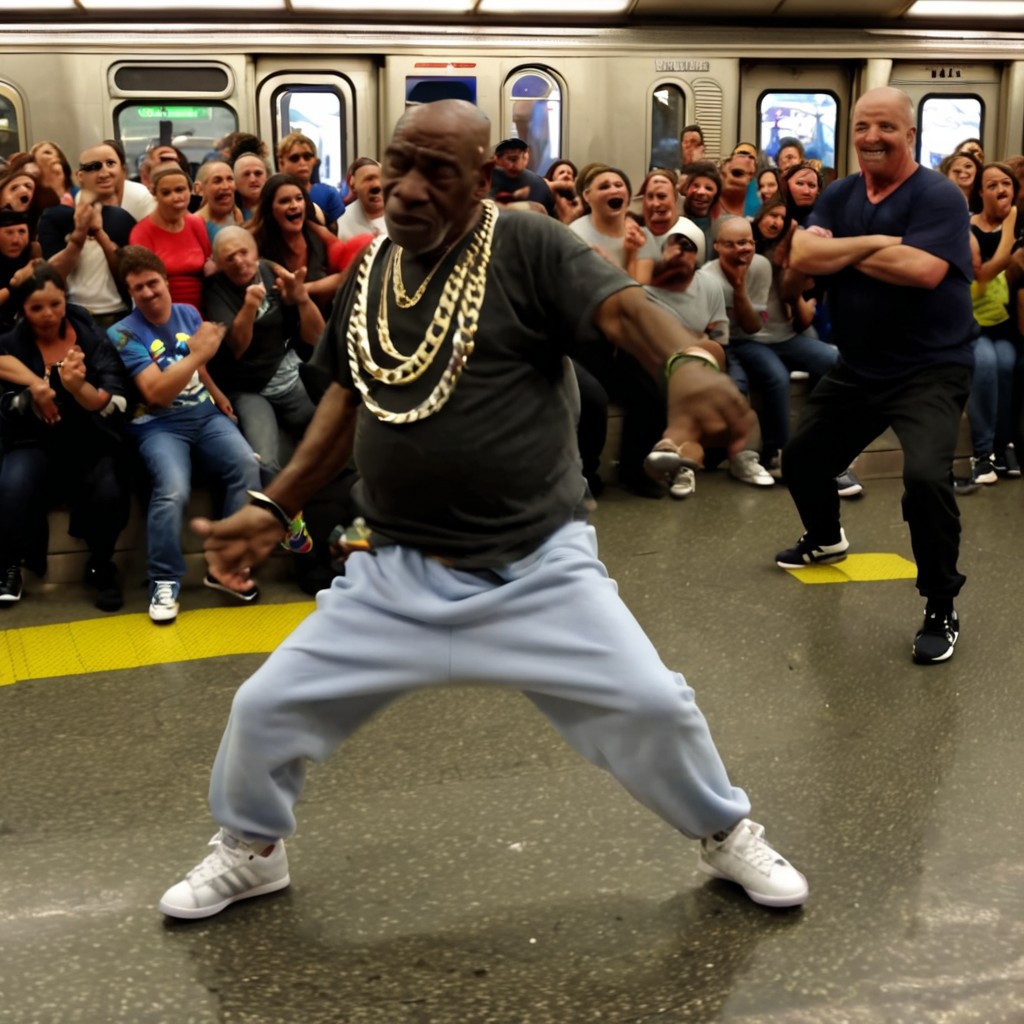 Old man breakdancing, he's on the subway platform in front of a row of unicorns, hippo dancing in the background, old man is busting out some fresh dance moves and doing the most difficult of breakdancing routines, he's also got them dope sneakers on, old man also has a fat diamond chain on and iced-out rings on, impressive, most impressive