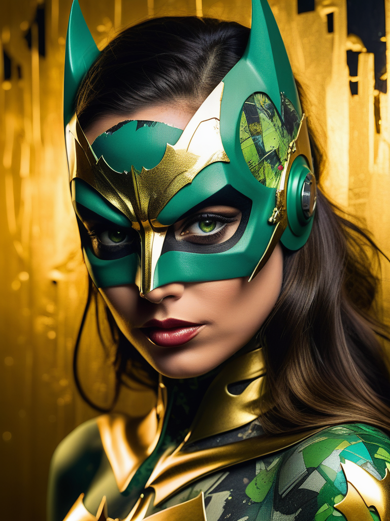 <lora:11VisualArt_Hap_XL:2.5>,Sandra Chevrier style,collage,torn paper effect ,pop art, comic book,batman, Robin, superhero, Sexy woman with gold and green mechanical body, glowing green face, glowing green skin, cinematic photography, golden cobweb, majestic, awesome, inspiring, closeup, smooth, atmospheric haze, cinamatic composition, soft shadows, national geographic style, green glow, extremely detailed