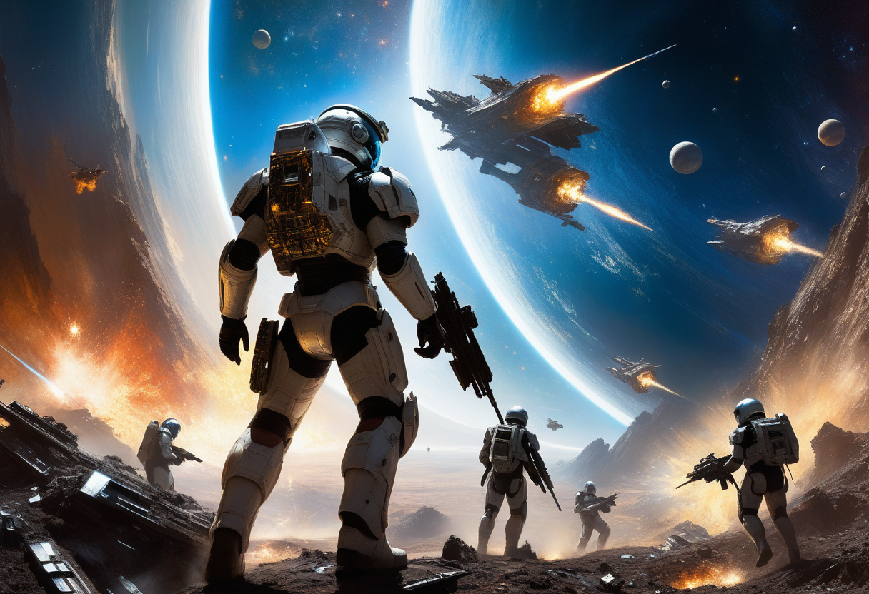 <lora:10NaturalismPainting_Hap_XL:1.5>, Thomas Moran style, oil painting, nature, Space infantry combat, soldiers clad in futuristic armor, floating amidst a backdrop of distant stars and a planet's silhouette, high-tech weapons emitting a soft glow, weightless struggle, debris field in the foreground, spacecraft wreckage, dynamic poses, zero gravity effect, digital painting, cinematic, ultra realistic.