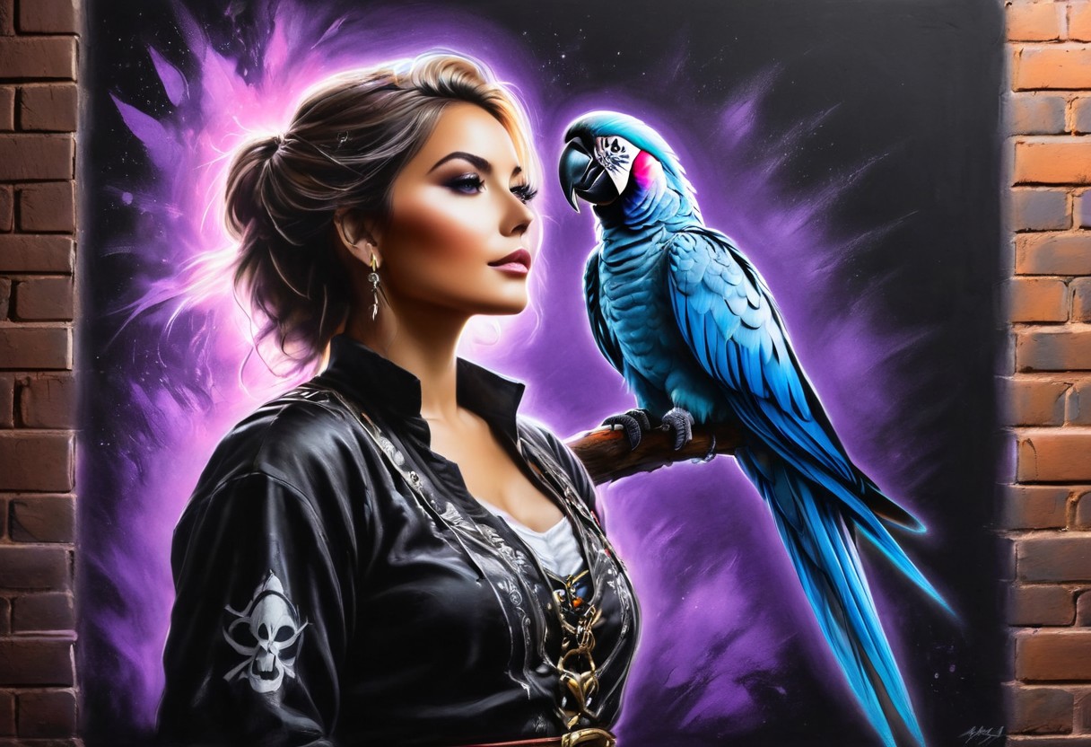 graffiti, pastel, graffiti on brick wall, spray paint on wall, colorful graffiti, street art, spray paint, street canvas, graffiti artist, graffiti art, spray art, spray art, (((old worn out brick wall: 1.4))). Moral on the wall of the house. In the middle of a moonlit night, a beautiful female pirate poses confidently. While her silhouette stands out against the black background, a glowing parrot with shimmering pastel purple phosphorescence gracefully perches on her shoulder, radiating a calming glow.
