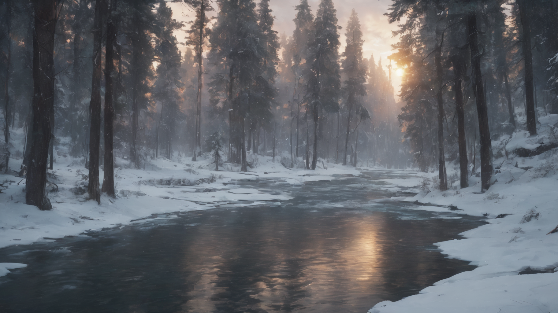 a river running through a forest. life is strange 2,beautiful,peaceful,snow,creek,lush,ice,matte painting,fantasy (painted by rembrandt 1 9 8 6),cinematic oil painting (8 k) trending on july 4 k (digital art,,,,,