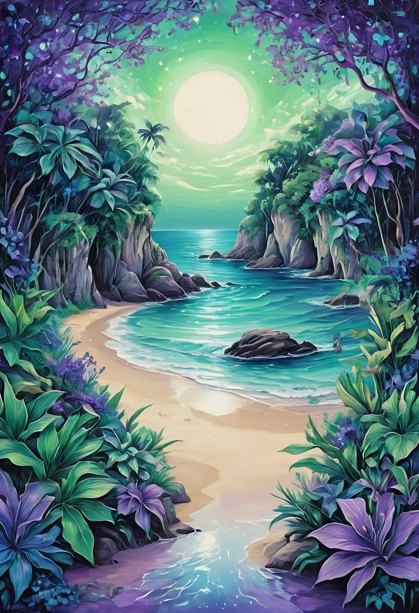 novuschroma14 style tropical beach and seaside, violet green and blue colour