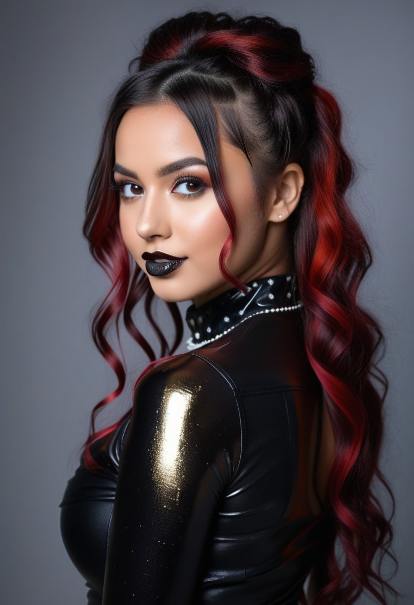(RAW photo, subject, 8k uhd, dslr, soft lighting, high quality, film grain, Fujifilm XT3, masterpiece, best quality, extremely detailed photograph, volumatic light, ray tracing, bust shot , extremely detailed 8k wallpaper, nsfw), (two gothic girls:2.0), ((beautiful african girl or german girl), (black or brown or white (paint splattered:1.8) skin), (paint splattered:1.8) gothic clothesi, (long or medium lenght straight wavey curly black blonde brunette white (paint splattered:1.8) hair), (colorful streaks), undercut hairstyle, chin bangs, dread hairstyle, braid hairstyle, delicate face and eyes, (glossy lips:2.0), (huge:1.6) breast, small waist, hourglass figure, (glasses:0.8), (painting portrait picture on canvas:2.0), in darkroom, dark walls, sexy pose, look at viewer, smile, hdr,, indirect lighting, soft lighting