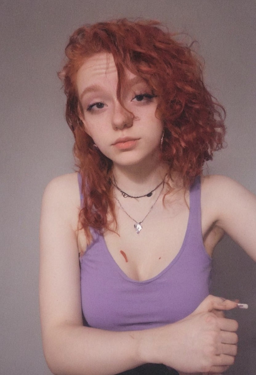 woman, egirl_pfp, polaroid <lora:egirl_pfp:1>, Molly, MJ, auburn hair, violet tank top, cleavage, polaroid photo