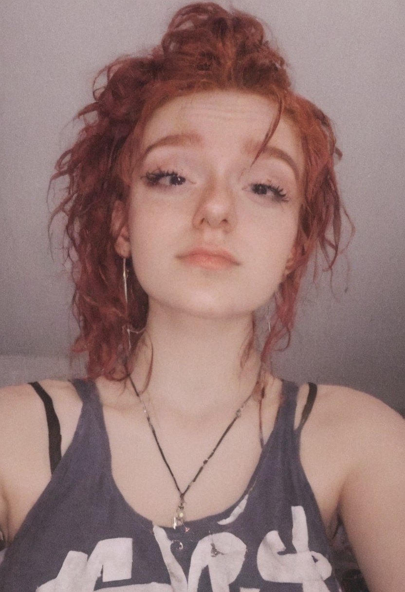 woman, egirl_pfp, polaroid <lora:egirl_pfp:1>, Molly, MJ, auburn hair, violet tank top, cleavage, polaroid photo