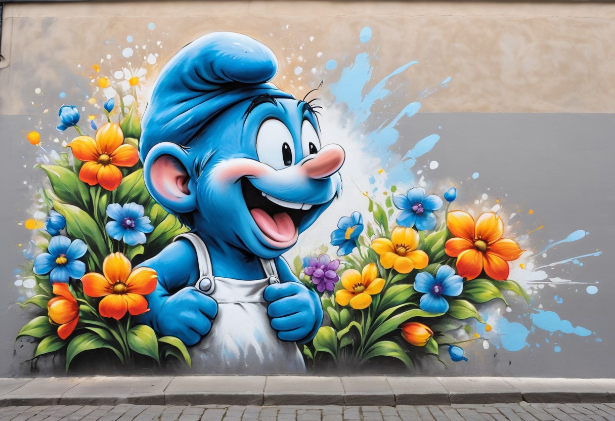 A colorful street mural featuring a Smurf character holding a bright bouquet of flowers. The Smurf is smiling and surrounded by a variety of bright and cheerful blooming flowers. The background of the mural includes splashes of blue and gray, creating a lively and artistic atmosphere. The scene is set in a quaint alleyway with a cobblestone street and lush greenery on the sides.