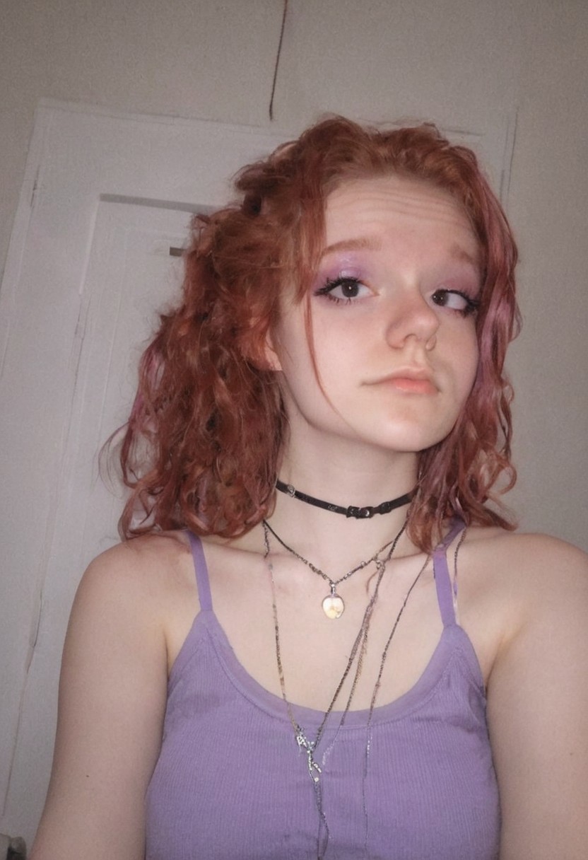 woman, egirl_pfp, makeup <lora:egirl_pfp:1>, Molly, MJ, auburn hair, greyish violet tank top, violet spaghetti strap tank top, cleavage, polaroid photo, large boobs