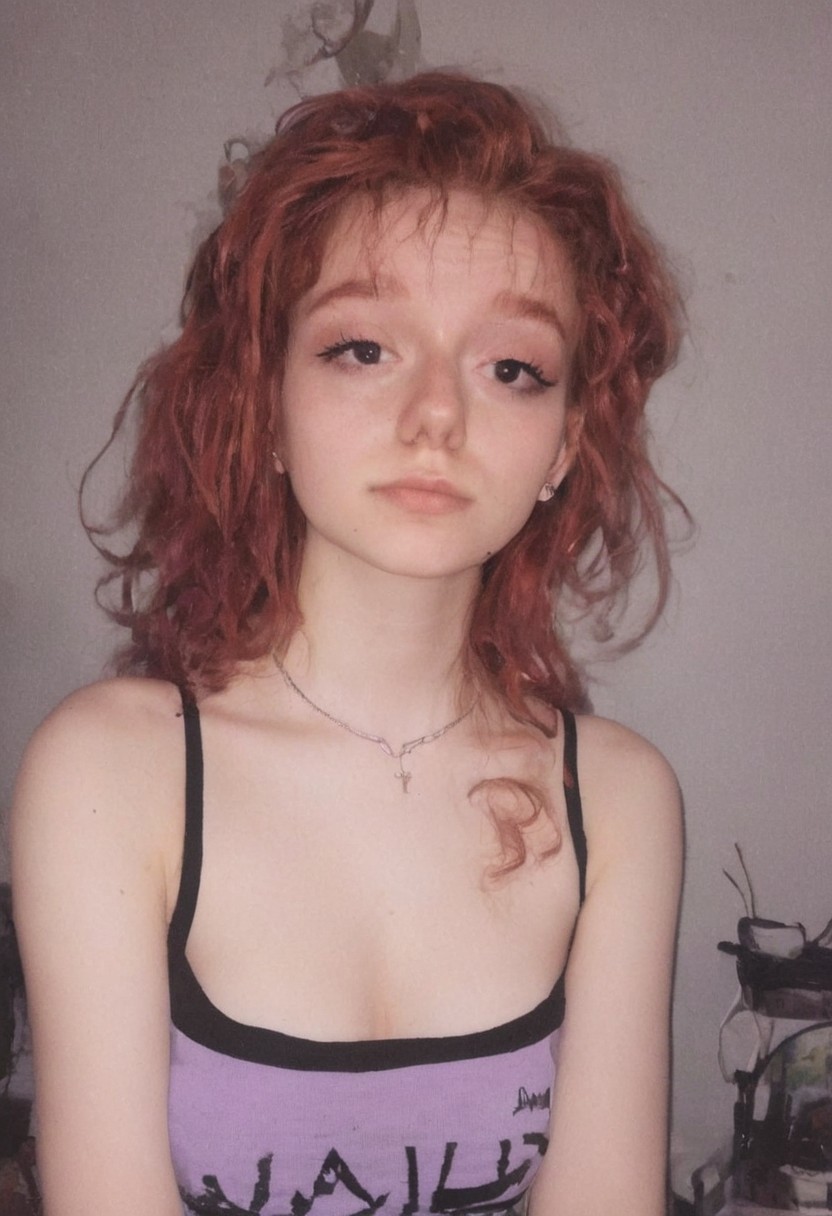 woman, egirl_pfp, polaroid <lora:egirl_pfp:1>, Molly, MJ, auburn hair, violet tank top, cleavage, polaroid photo
