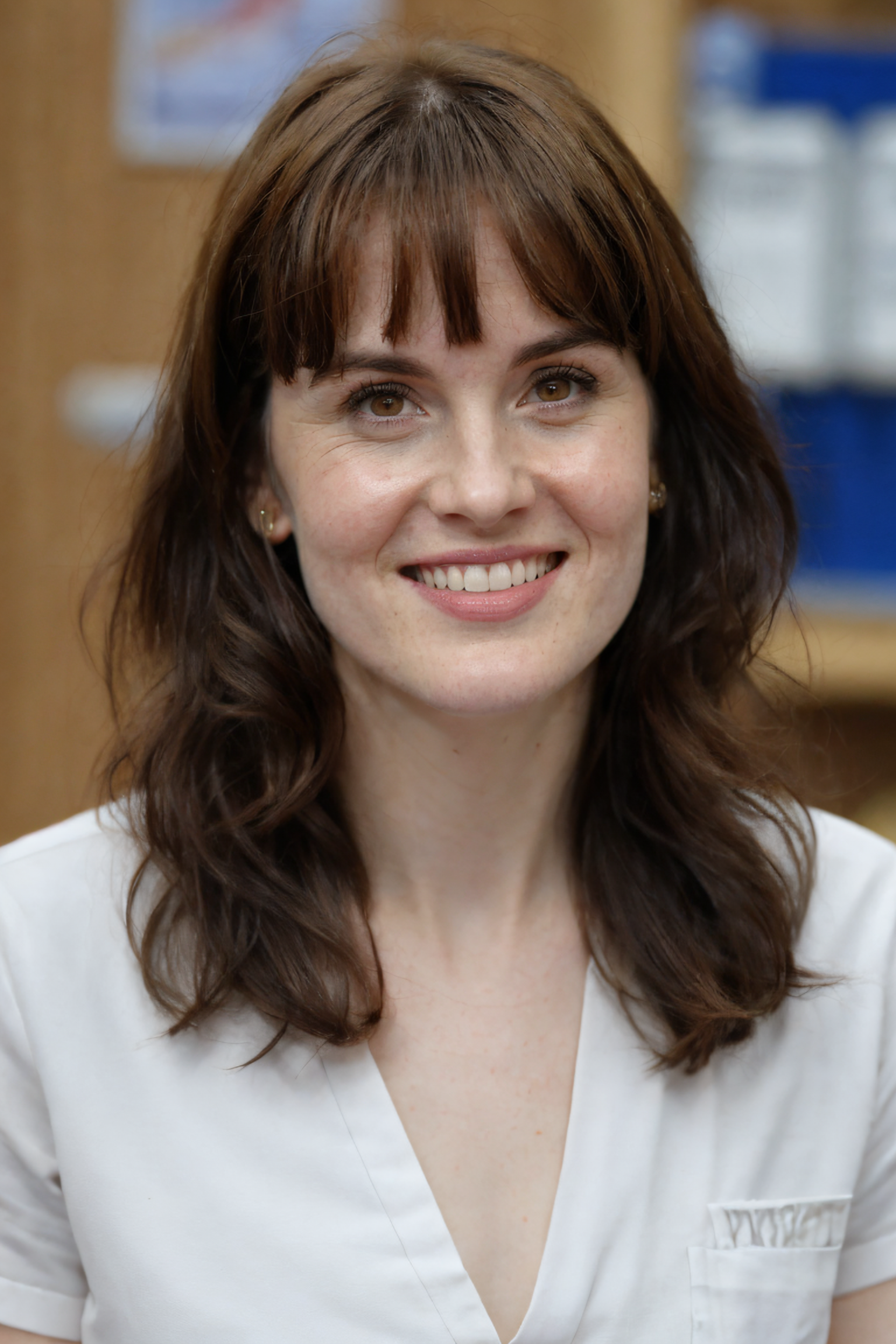 1girl, pov, nurse wearing a white scrubs, bent over, sweet smile, with bangs, at the hospital, detailed face, (photorealistic, absurdres, best quality, masterpiece:1.4), (high detailed skin:1.3) <lora:michelle_dockery_lora_v01:1> michdoc