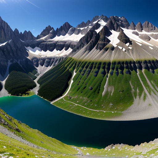 mountain, lake, clear water, best quality, alpine mountains, mountain village, photorealistic, realism,