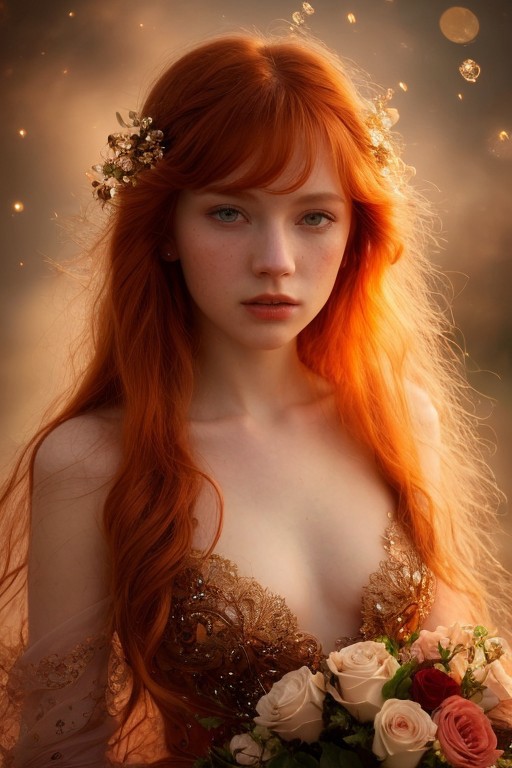 a lonely beautiful red head woman, White clouds, rose made of amber, atmospheric, sparkly, incredible, dreamy, magical, backlit, award winning, intricate details, ultra details, realistic, professional, photographic quality, highly detailed, super sharp, close up, fantastical, enchanting, storybook style, golden hour light . Surreal, ethereal, dreamy, mysterious, fantasy, highly detailed