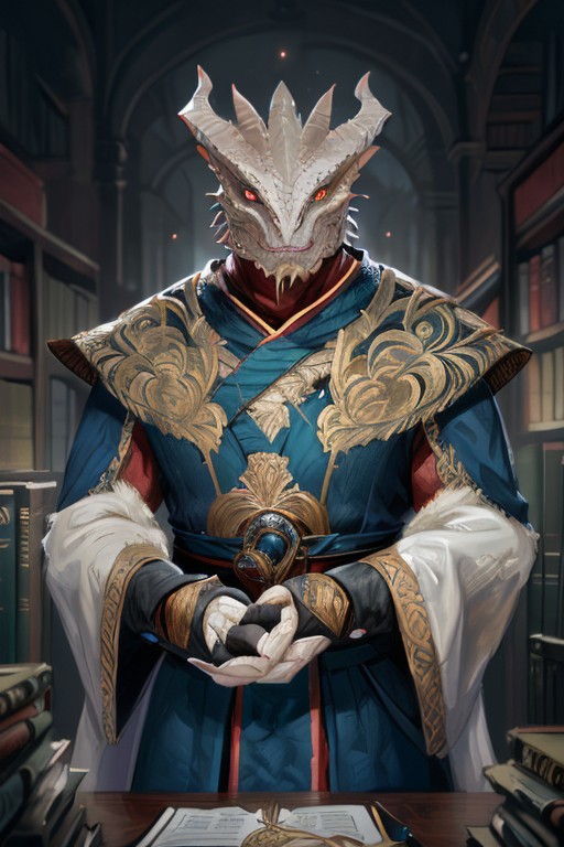 score_9, score_8_up, 8, score_7_up, score_6_up, solo, portrait of a young dragonborn sorcerer, modelshoot style, Intricate, High Detail, Sharp focus, dramatic, (extremely detailed CG unity 8k wallpaper), medieval era, painting by Ed Blinkey, Atey Ghailan, by Jeremy Mann, Greg Manchess, Antonio Moro, trending on ArtStation, trending on CGSociety, Intricate, High Detail, Sharp focus, dramatic, painting art by midjourney and greg rutkowski, illustrated, brushwork attire, oil painting, dragon tail, horns, dragon horns, no humans, fangs, facial mark, scales, multicolored skin, hexagonal scales, scaleborn, _brass and red_ skin, BadDream, dragonborn, [brass and red] dragonborn (male, male dragonborn, red horns. blue cloister robes, red eyes, Background library, 4 finger claws, library filled with book shelves, collecting books and artifacts from every culture and civilization, Expressiveh, Dragonborn, furry dragon, dragonborn, [more brass scales, some red scales] dragonborn (fur trim on blue robe), other descriptive tokens (attire, the blue robes with rolled-up sleeves, embroidered sigils, practitioner of magic, robe bares both the symbol of a cloister and the Fist of Bros - a symbol of the Fury of Bros), cloistered order of magic users, more militant group, Fury of Bros emblem, fur inlay of cloak, fur collar, brass scales with few red scales sporadically, most brass scales, expressive face, expressive, clear eyes, visible eyes,), thedarkurge, dragonborn \(dnd\),