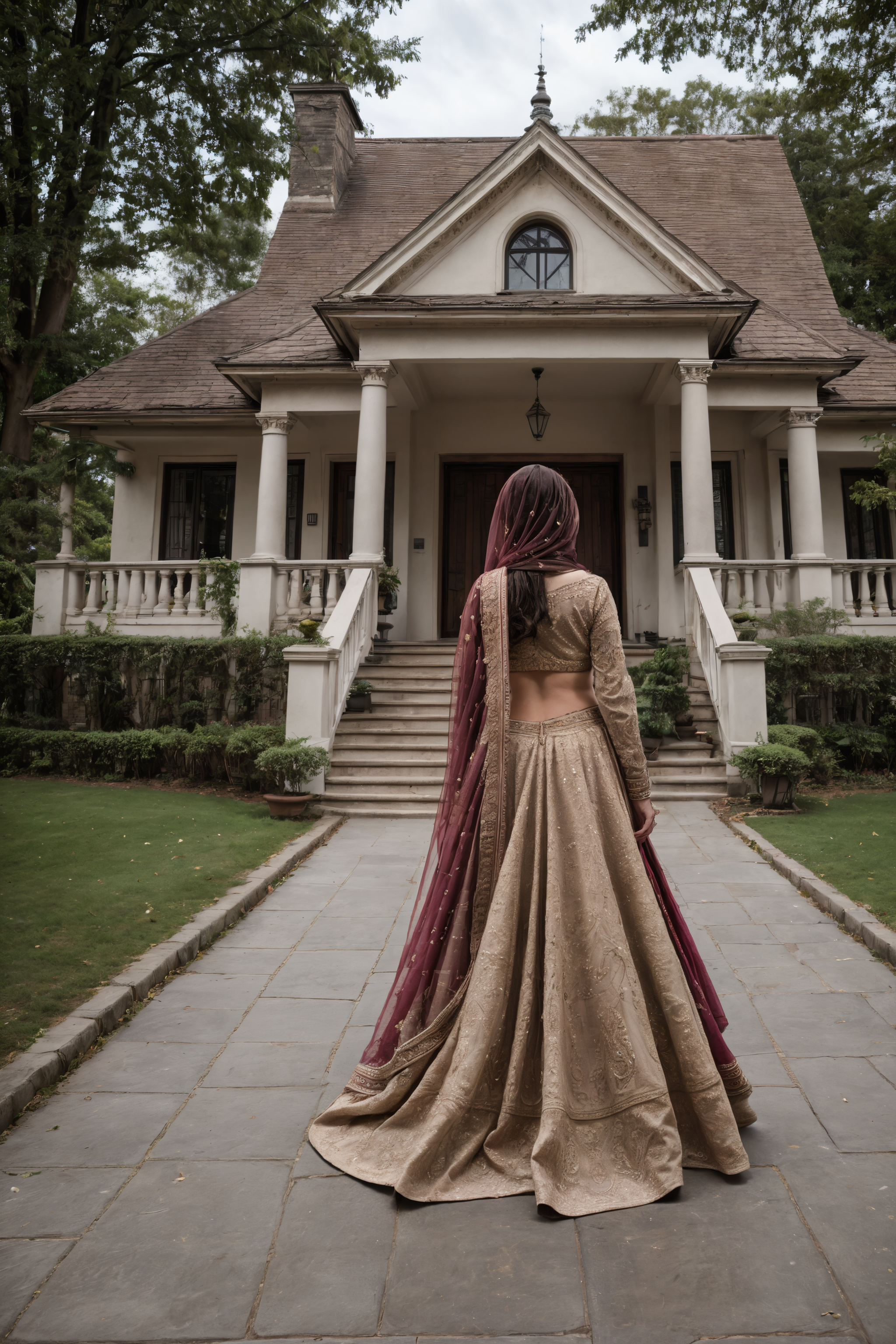 <lora:l_32:-0.5>, wide angle cinematic captivating photo, front side view, beautiful pakistani hijabi bride woman walking along paved pathway towards (villa:1.3), <lora:villa:0.5>, country manor, house, windows, roof, grand doorway entrance, granite pillers, england, london, luxury, exquisite, posh, detailed ornate embroidered bright beige clothes, gold jewellery, smile, teeth, <lora:Bridal_Lehnga_By_Stable_Yogi:0.7> 00red00bridal00legnga, 1girl, solo, lifting skirt,<lora:sps2:0.6> supershorty, masterpiece, best quality, absurdres, highres, 4k, intricate details, highly detailed, <lora:add_detail:0.6>, wedding reception, beautiful composition, <lora:right side position:1> rside, right side,