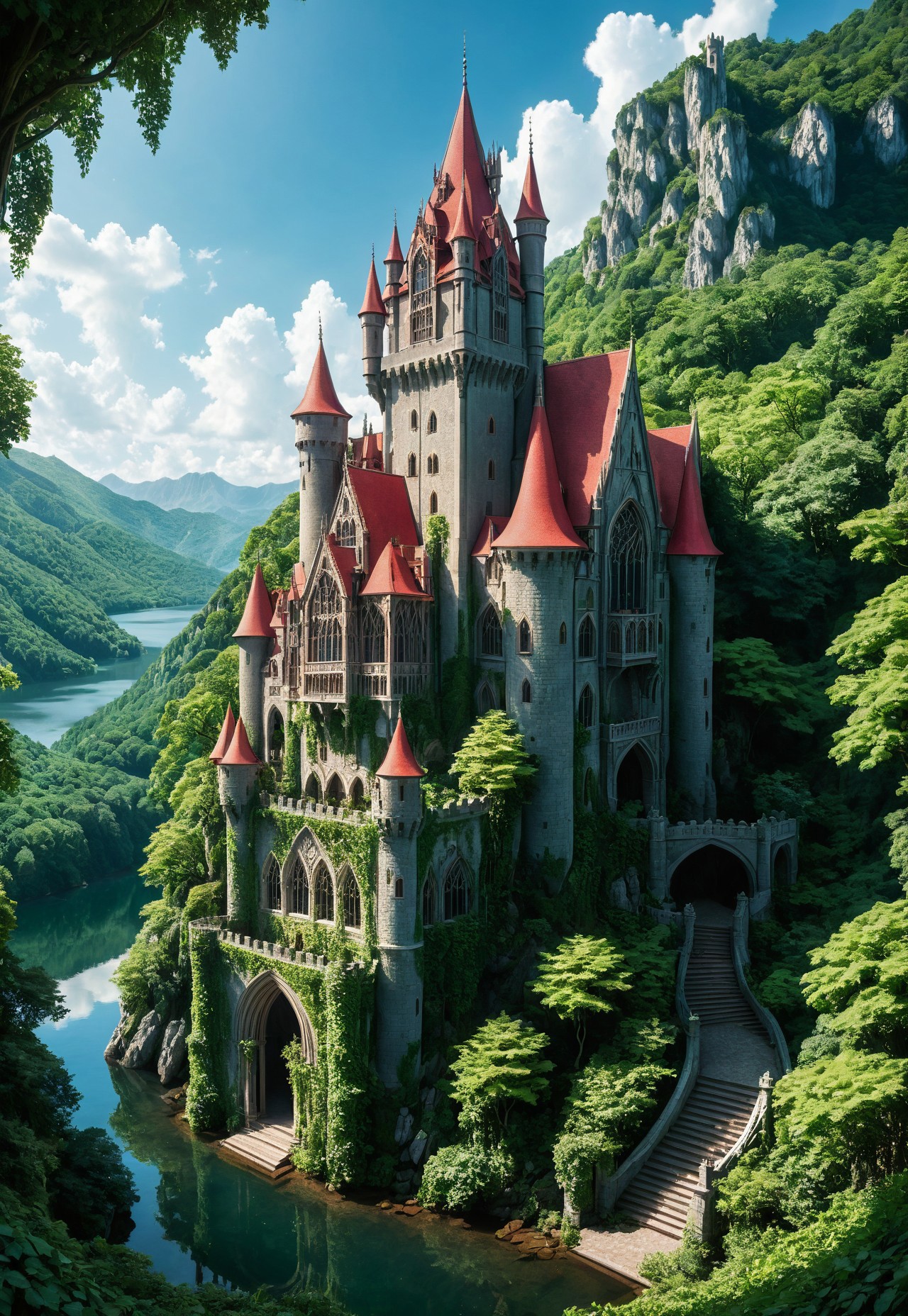 anime style, fantasy art, Create a fantastical, highly detailed castle nestled within a lush, forested mountainside. The castle features intricate Gothic architecture with tall spires and arched windows, topped with red-tiled roofs. The structure is partially covered with creeping ivy and surrounded by dense green trees and rocky cliffs. In the foreground, a serene lake reflects the image of the castle and the surrounding nature. The atmosphere is tranquil and enchanting, with soft, diffused light filtering through the foliage, creating a mystical, fairy-tale ambiance."