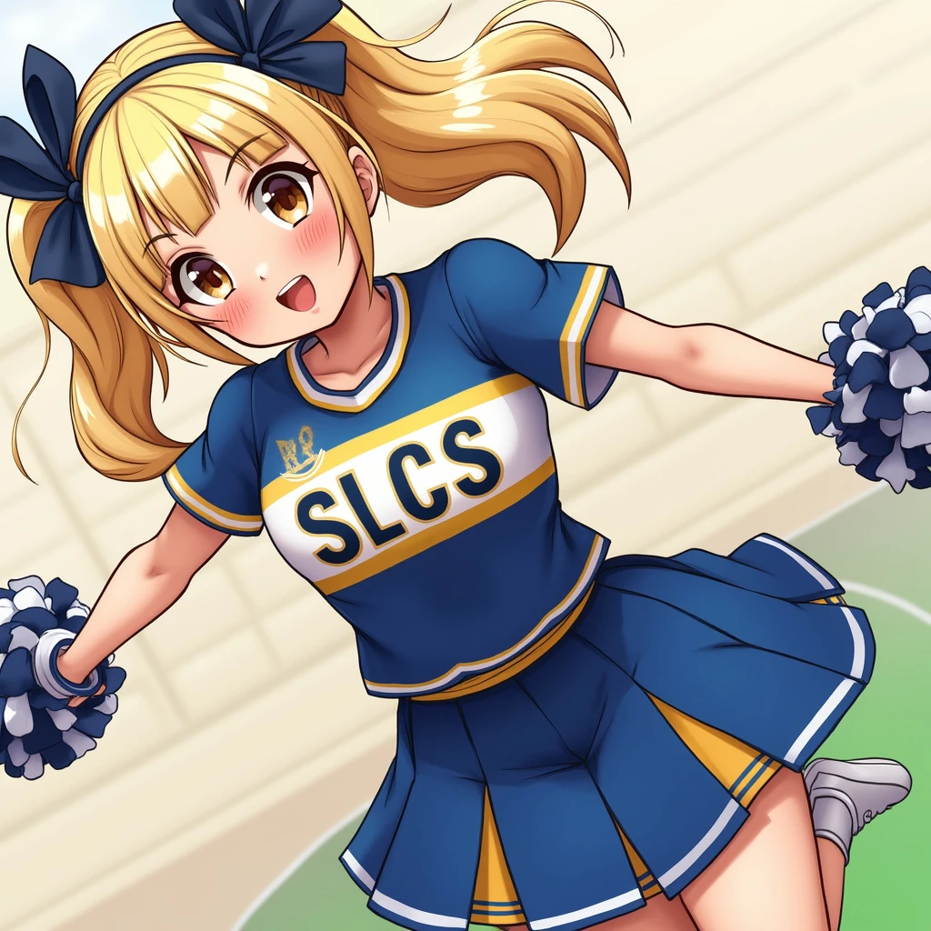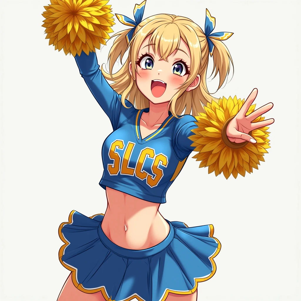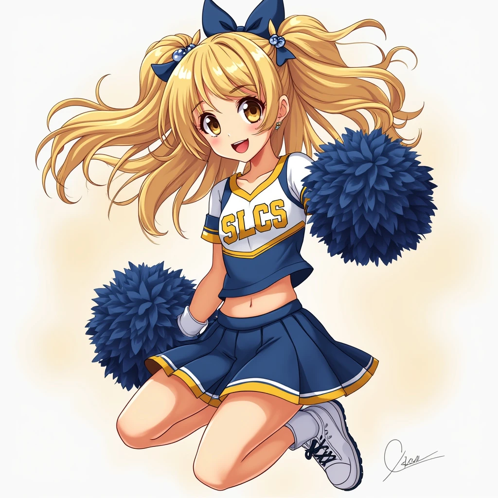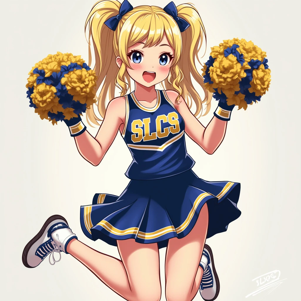 cartoon, girl, blonde, pretty, cheerleader, blue and gold uniform with the letters SLCS, skirt, jumping