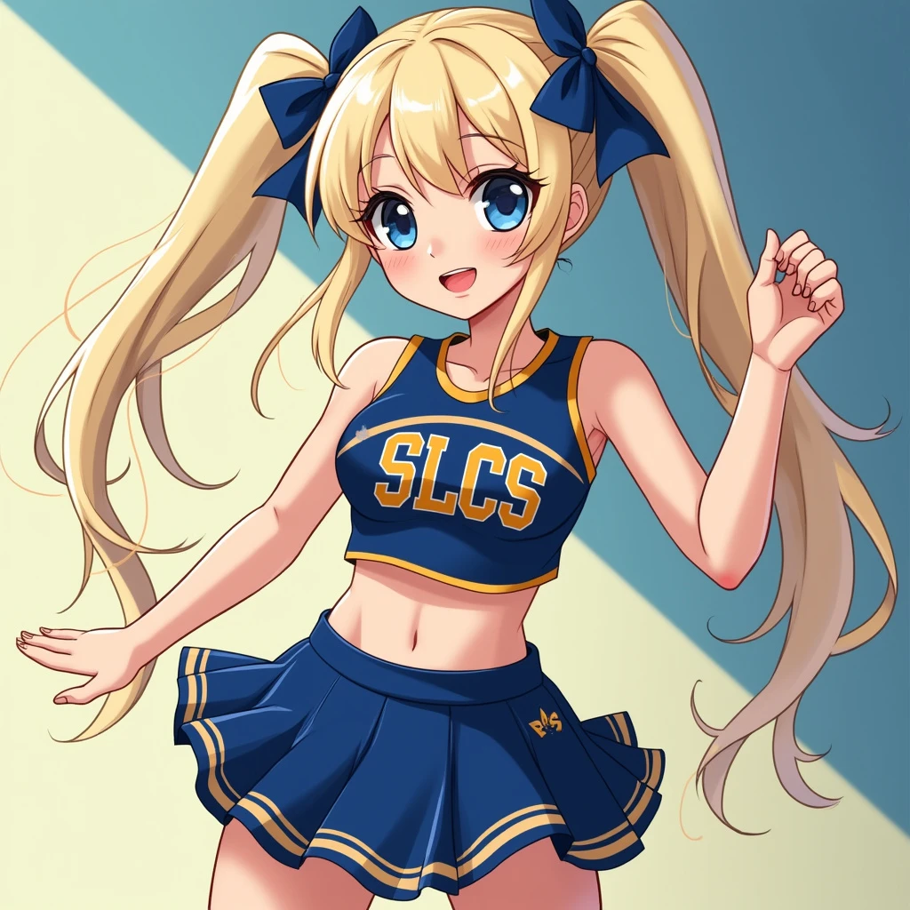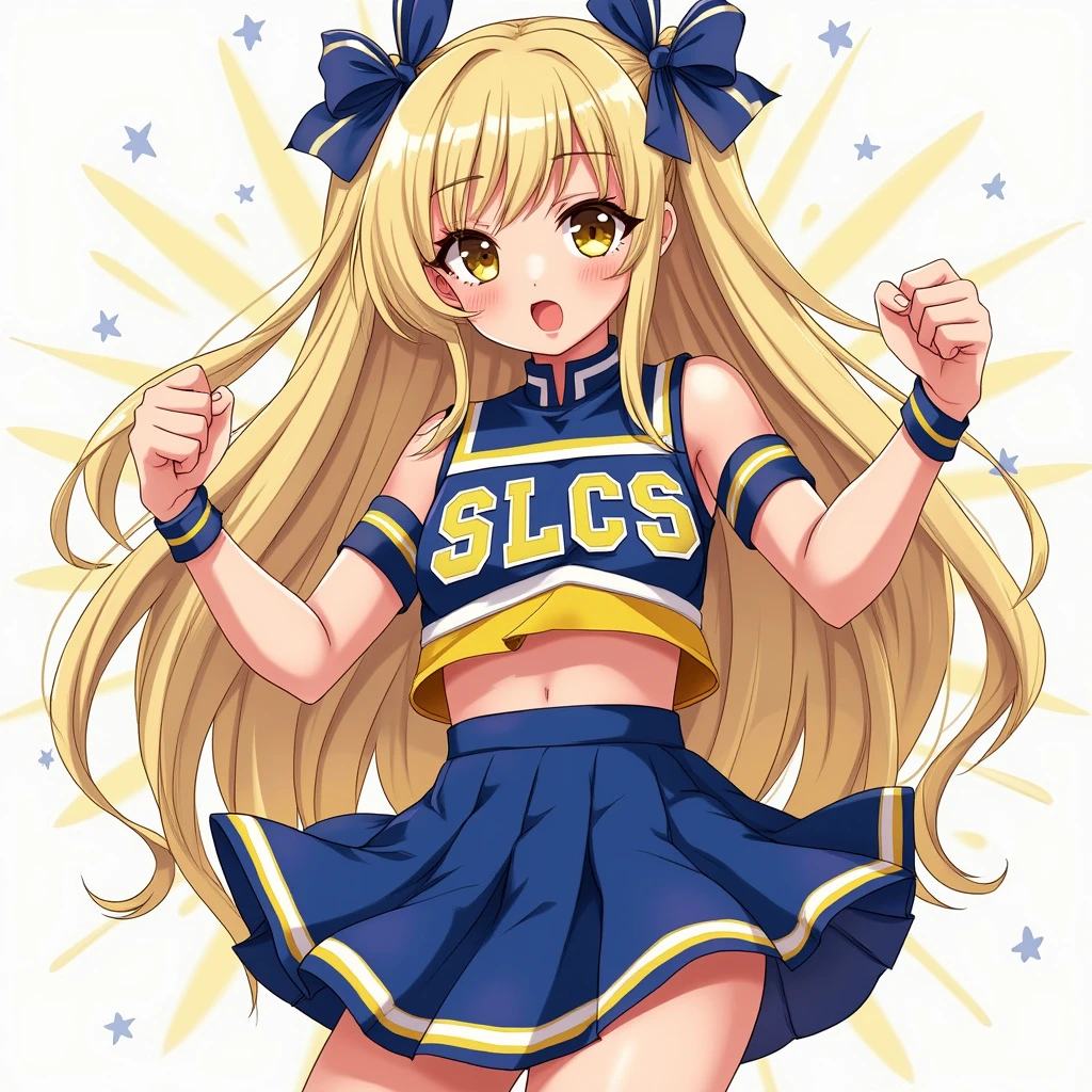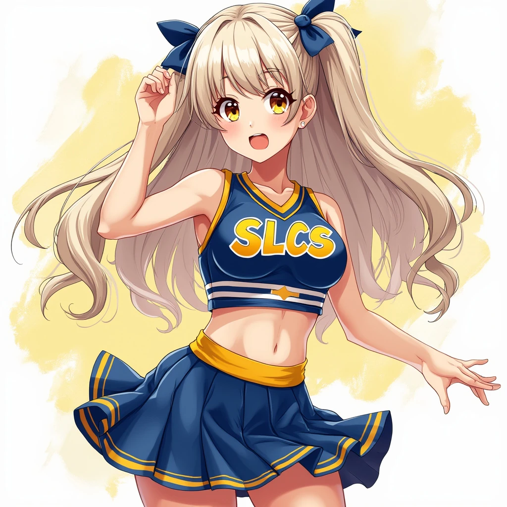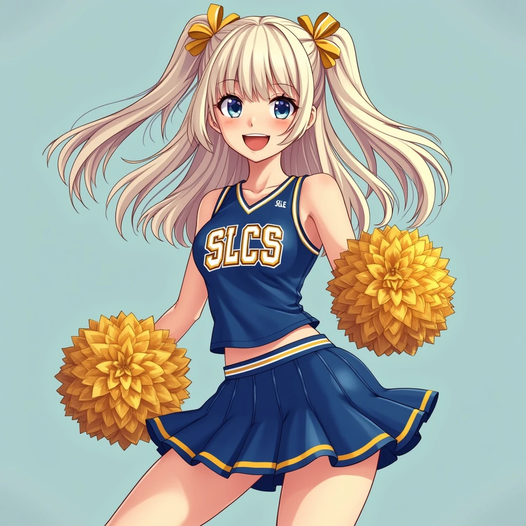 platinum blonde girl, very attractive, young, real photo, pretty, cheerleader uniform in blue and gold with the letters SLCS, skirt, dancing