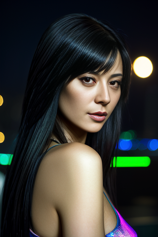 cath3rin3b311, long hair, wearing holographic cyberpunk clothing, surrounded by neon-lit cityscape reflections, vray render, ray tracing, subsurface scattering, by Josan Gonzalez and Liang Mark (upper body shot), (looking at viewer:1.3), (hyper realistic:1.3), (portrait:1.2), highly detailed eyes, (highly detailed skin:1.3), (freckles:0.6), pores, (4k), back lit, rim light, <lora:Catherine_Bell_PMv1_Lora:1.3>,, ((Close-Up))