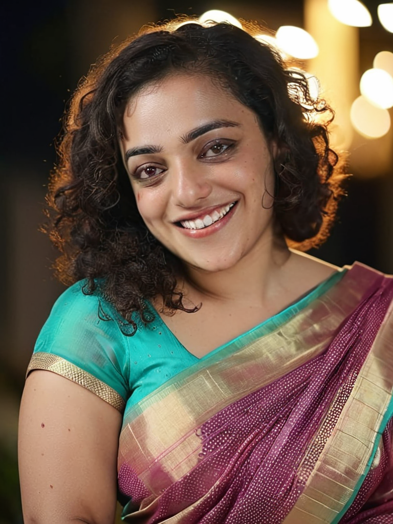portrait photo of Nithya M woman, solo, pixie curly hair, laughing, looking at the camera, ethnic Cinnamon saree and blouse, night time, contrasting background bokeh, skindentation, <lora:Nithya_M_SDXL_LoRA_prodigy_local_xformers_HNE:1>