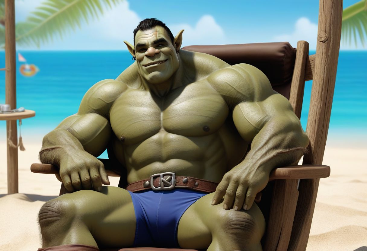 wowrcs, orc face, gentle smile, swole vein body, swimsuit, bulgue, hairy, slightly hairy, handsome like a gigachad, orc tusk, rest in the chair, beach, cartoon cgi style