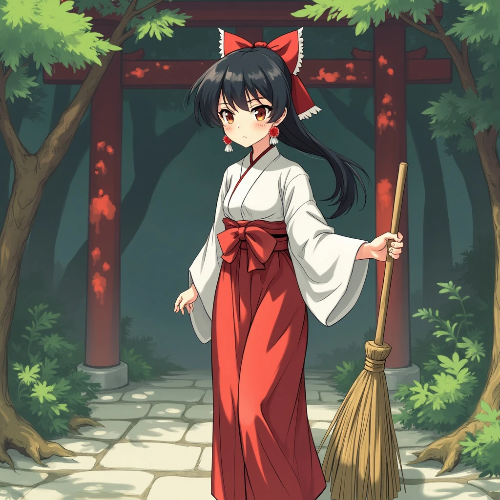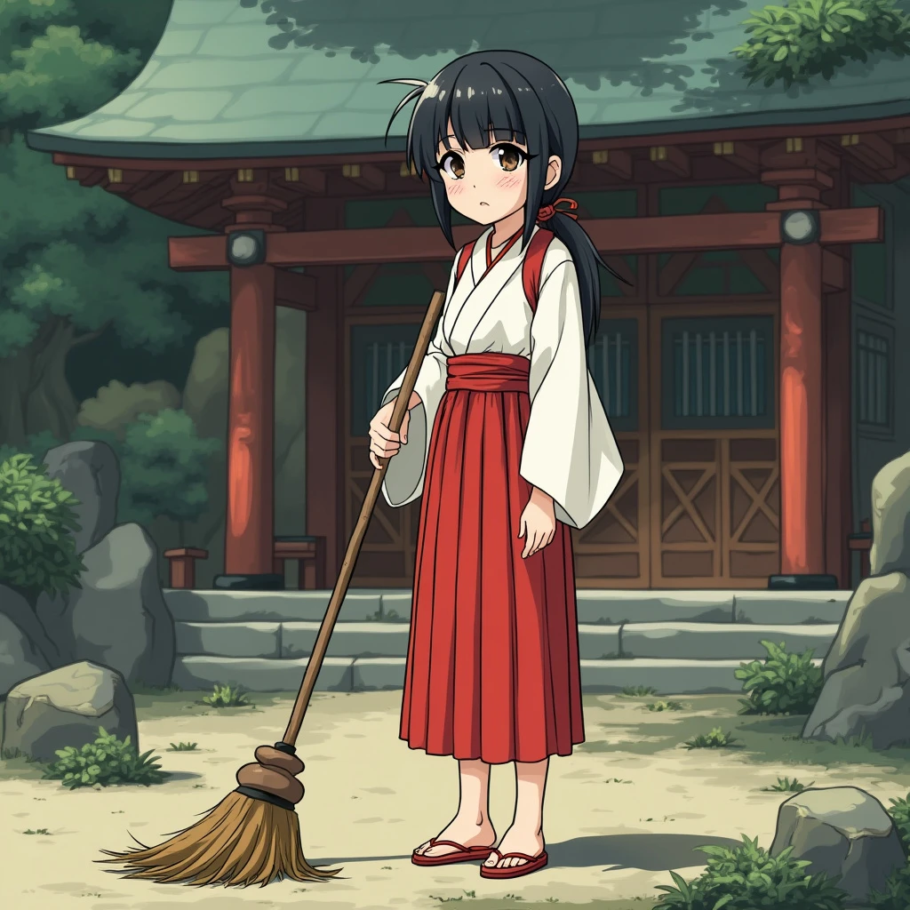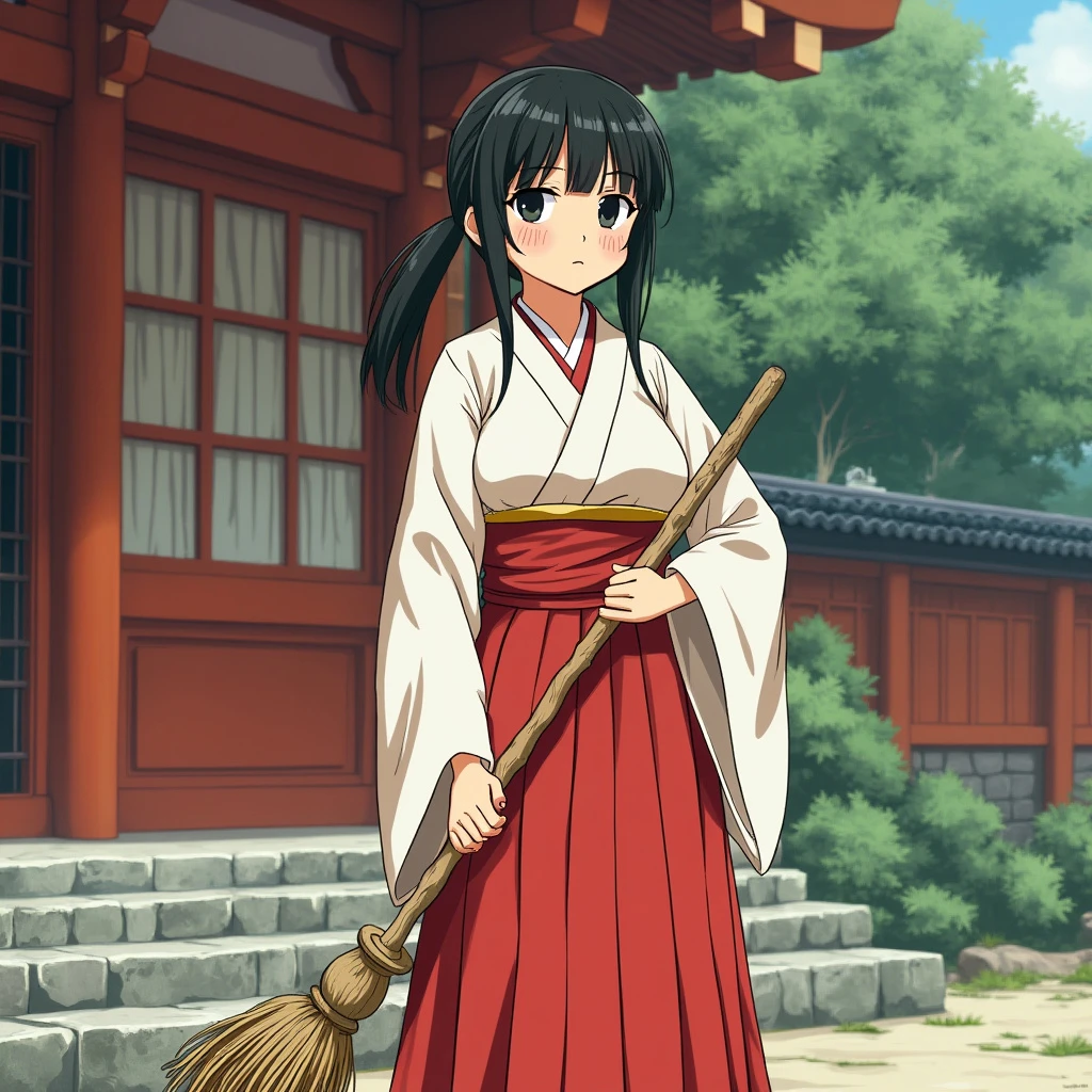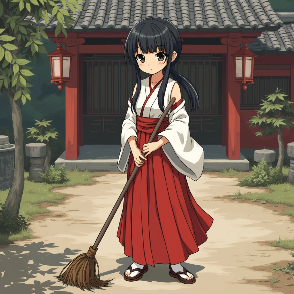 Shrine maiden, Anime girl, tall, black hair, low ponytail, freckles on cheekbones, narrow eyes, serious look, red and white kimono, sweeping shrine yard with broom