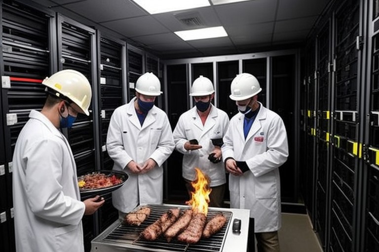 photo of a group of tech engineers in white coats and hard hats having a barbecue party inside server room, server racks on fire, a lot of smoke