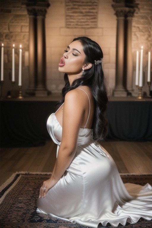 Photo•raw•8k uhd•dslr•high quality•ultra-realistic•realistic•realism•film grain overlay•Fujifilm XT3. View from side, dark gothic-style•candle-lit room•ancient stone altar. 1woman•wearing a (white satin gown dress)•(voluptuous)-body•kneeling•perfect(face•eyes•big nose•big lips•wide mouth).