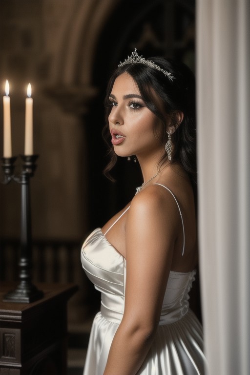 Photo•raw•8k uhd•dslr•high quality•ultra-realistic•realistic•realism•film grain overlay•Fujifilm XT3. View from side, dark gothic-style•candle-lit room•ancient stone altar. 1woman•wearing a (white satin gown dress)•(voluptuous)-body•kneeling•perfect(face•eyes•big nose•big lips•wide mouth).