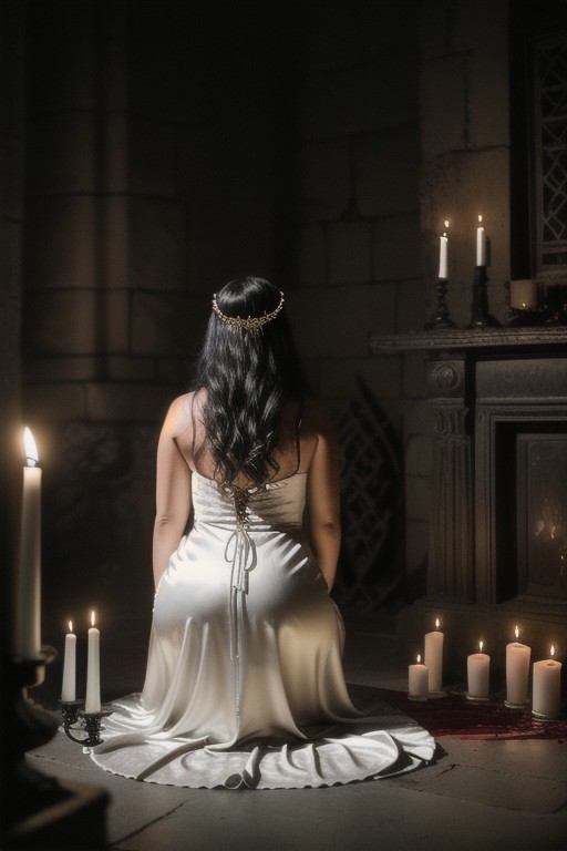 RAW photo, 8k uhd, dslr, high quality, ultra-realistic, realistic, realism, film grain, Fujifilm XT3. View from behind, dark gothic-room lit by candles•ancient stone alter•(golden chalice)•(blood spilling out). 1woman wearing a (satin white dress)•voluptuous body•kneeling•worshiping