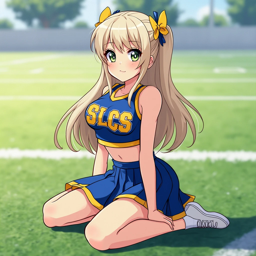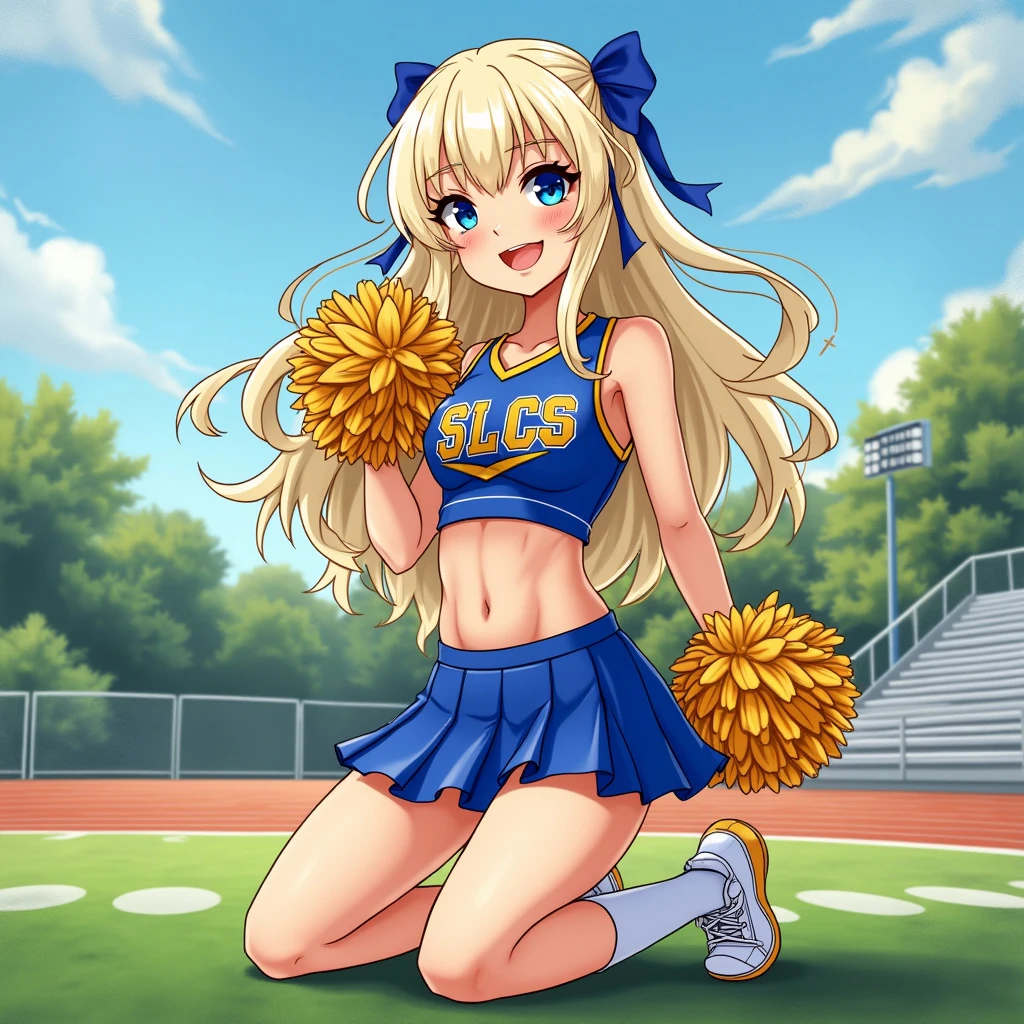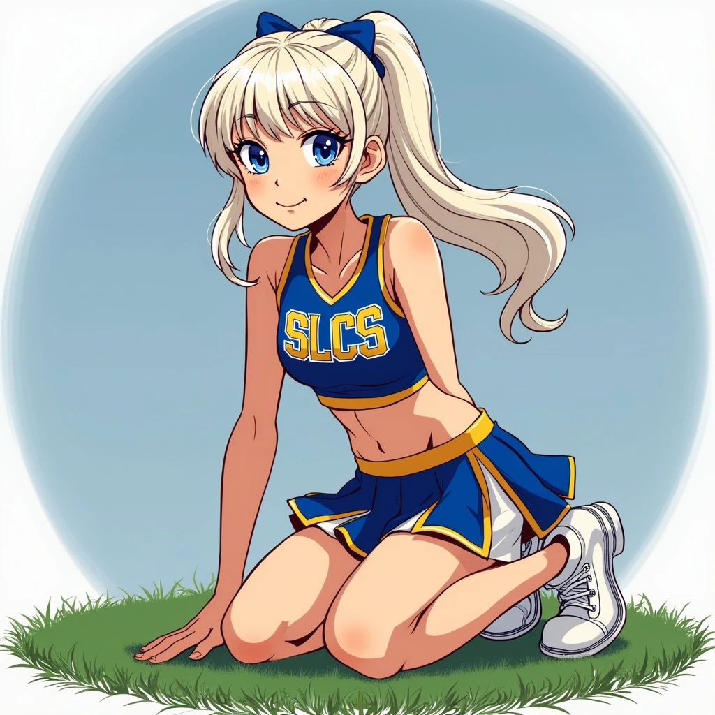 Cartoon, platinum blonde, pretty girl, cheerleader, blue and gold uniform with the letters SLCS, pleated skirt, cropped sleeveless top, kneeling on AstroTurf