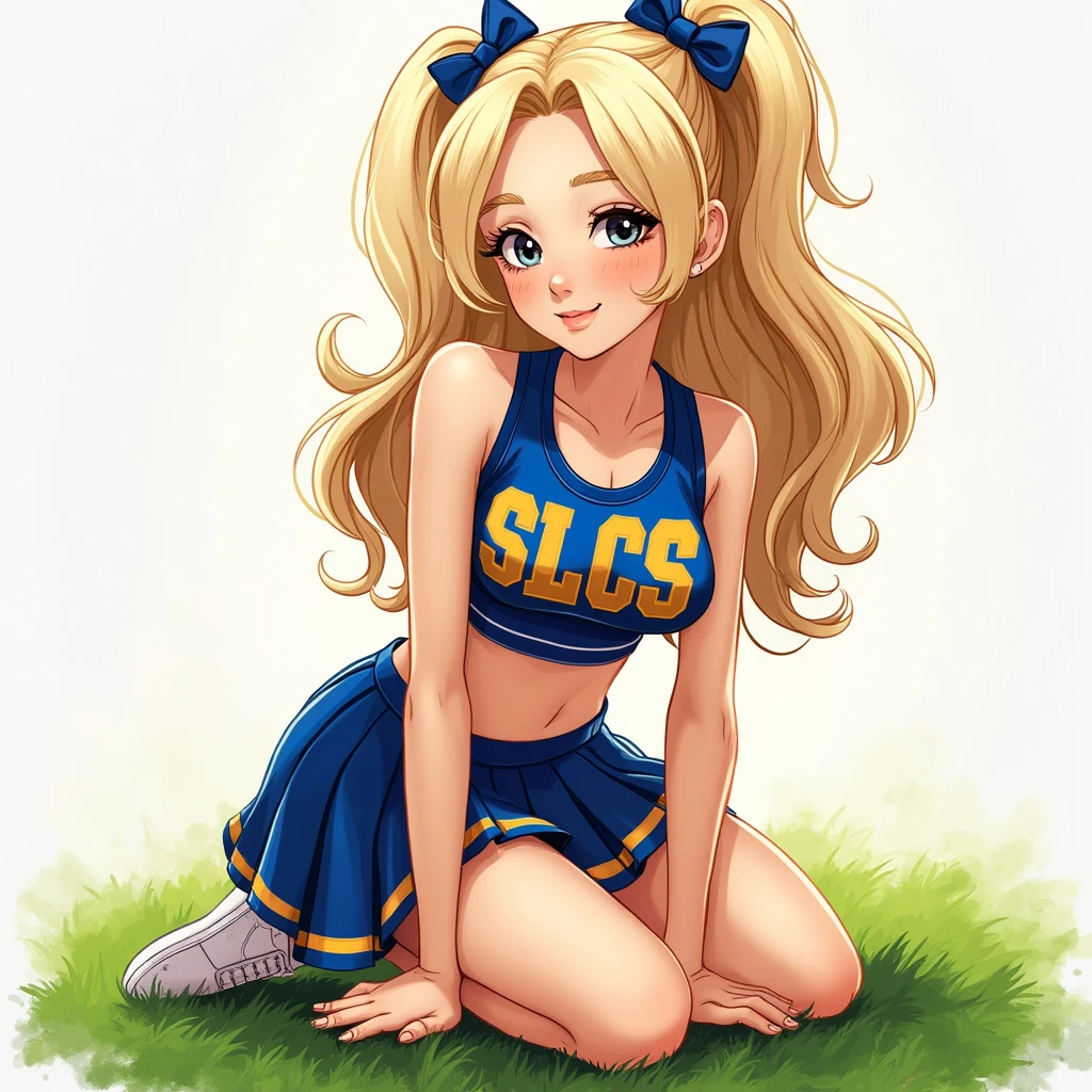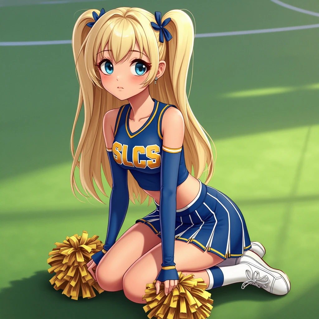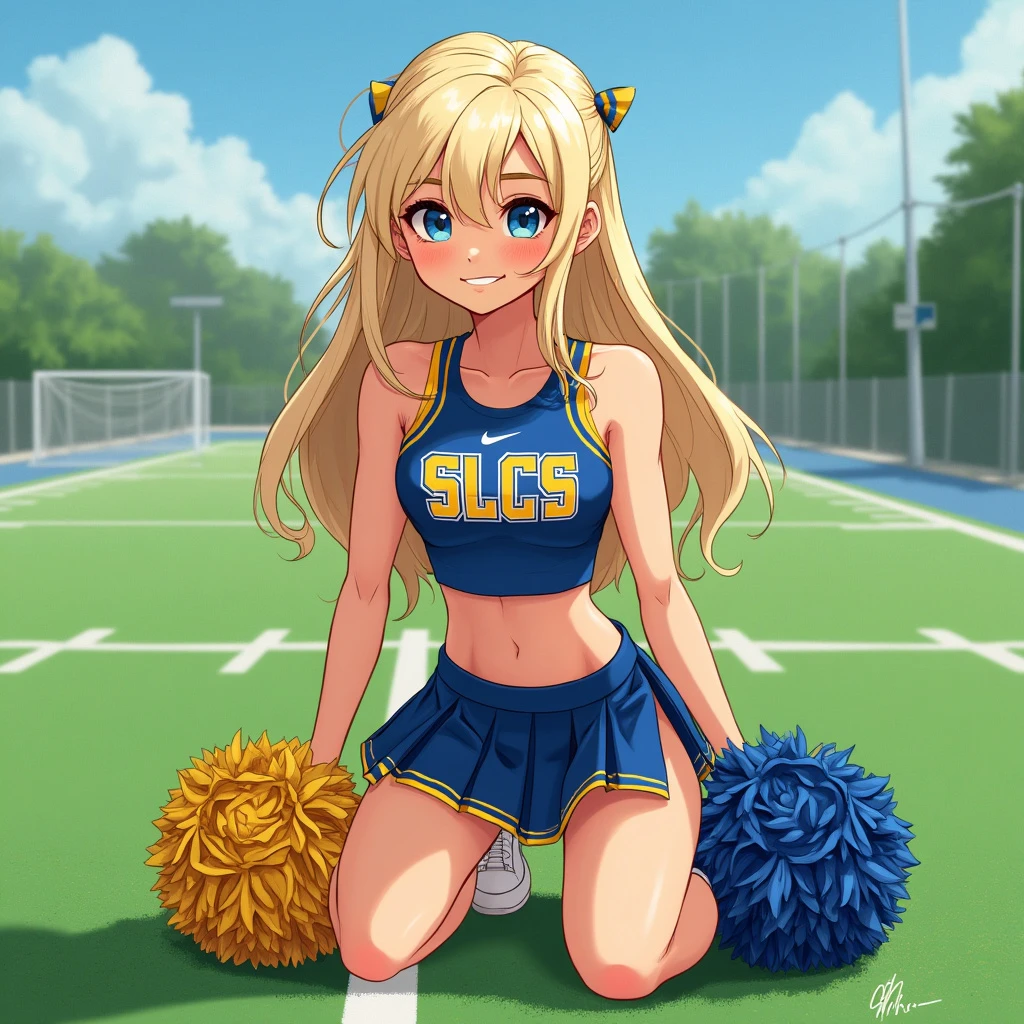 Pixar style animated character, platinum blonde, attractive teenage girl, cheerleader, blue and gold uniform with the letters SLCS, pleated skirt, cropped sleeveless top, kneeling on AstroTurf