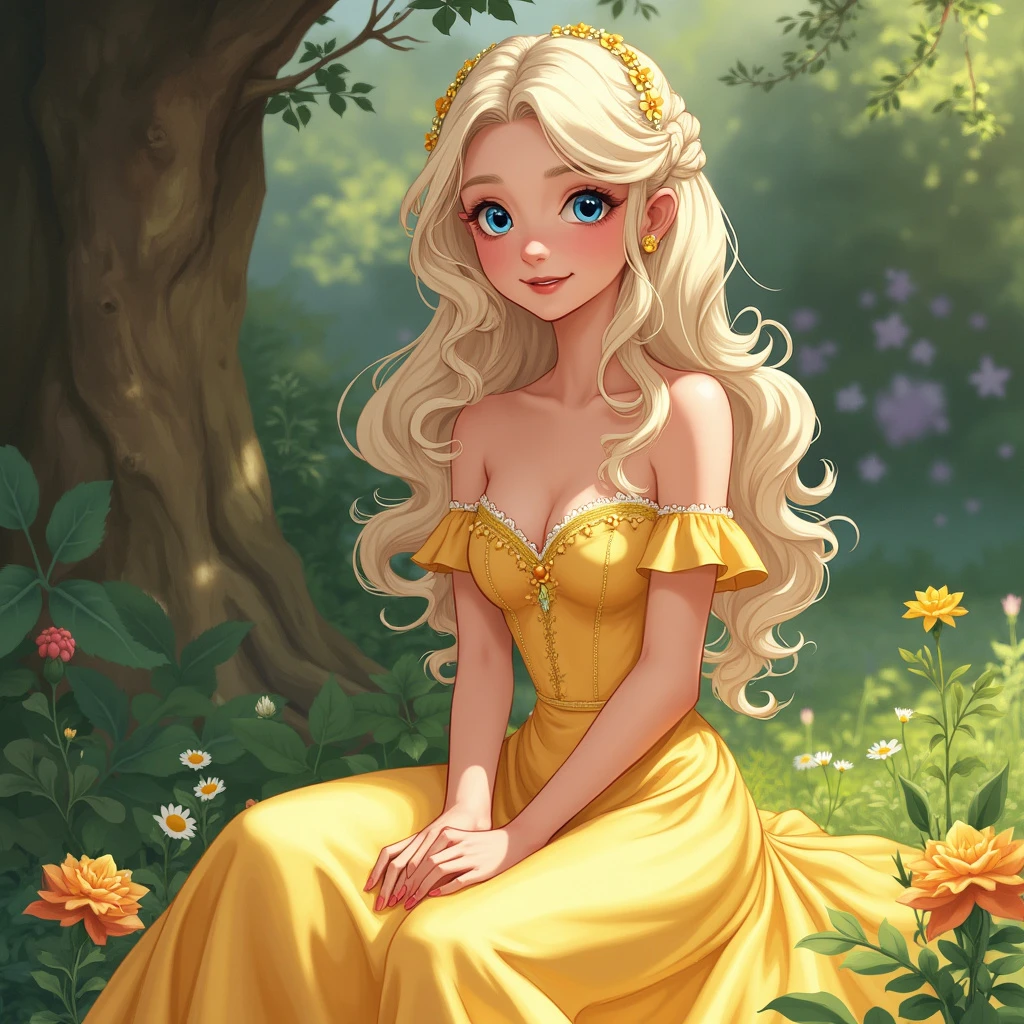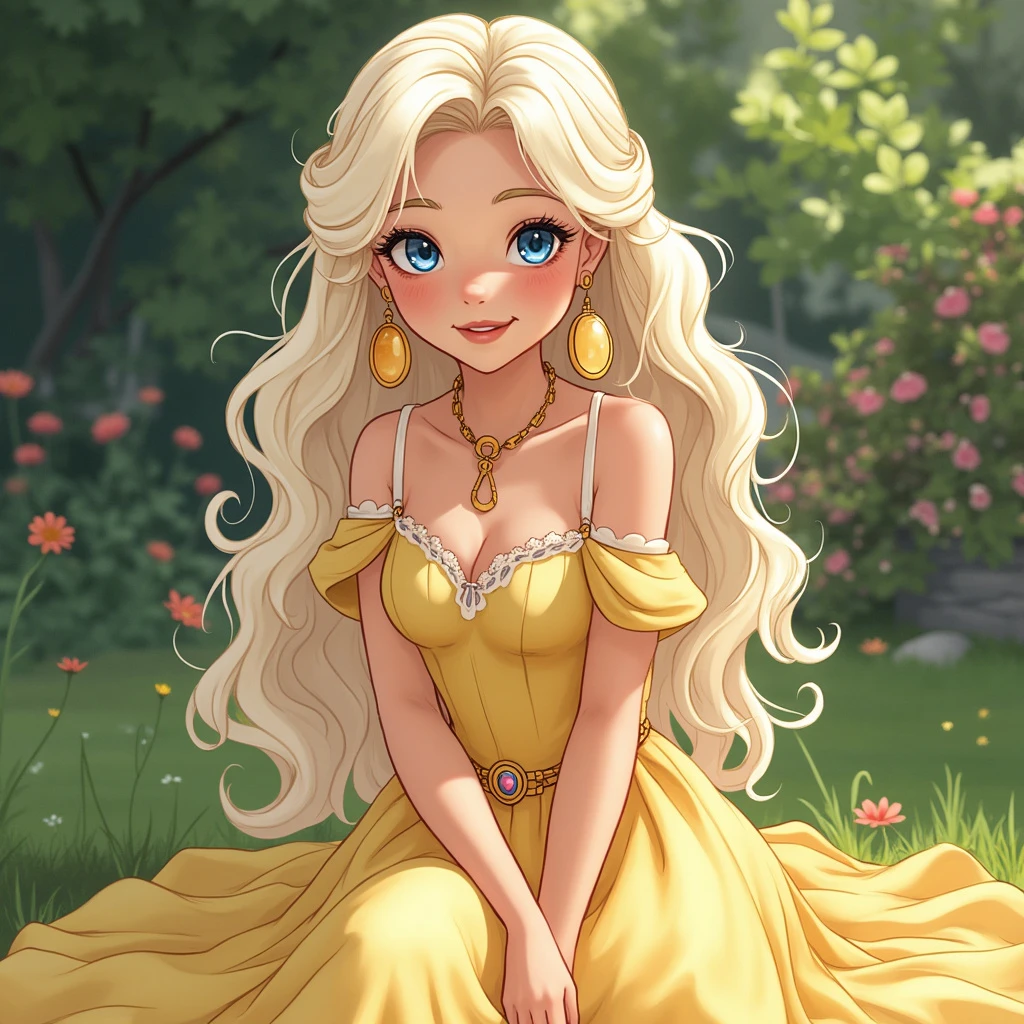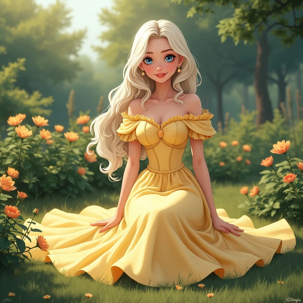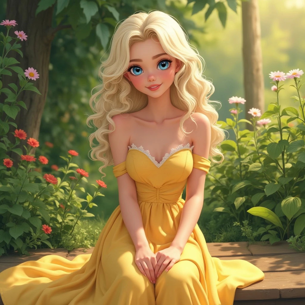 Disney Pixar animated character. Young woman with platinum blonde wavy hair and blue eyes, pale yellow princess dress costume, long skirt, sitting in garden