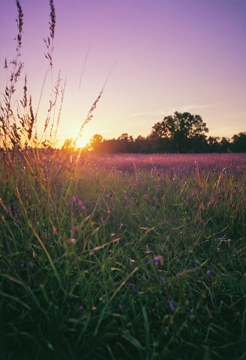 A beautiful sunset over a beautiful grassy field, beautiful sunset, purples, detailed, photo-realism, analog, Kodak Gold, film grain, sunrays, DSLR